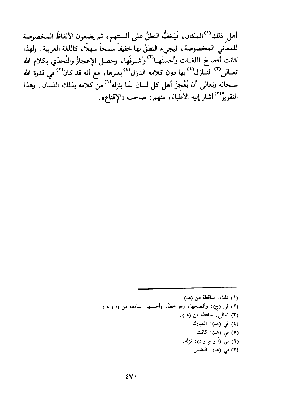 أَهْلِ ذَلِكَ الْمَكَانِ، فَيَخِفُّ النُّطْقُ عَلَى أَلْسِنَتِهِمْ، ثُمَّ يَضَعُونَ الْأَلْفَاظَ الْمَخْصُوصَةَ لِلْمَعَانِي الْمَخْصُوصَةِ، فَيَجِيءُ النُّطْقُ بِهَا خَفِيفًا سَمْحًا سَهْلًا، كَاللُّغَةِ الْعَرَبِيَّةِ. وَلِهَذَا كَانَتْ أَفْصَحَ اللُّغَاتِ وَأَحْسَنَهَا وَأَشْرَفَهَا، وَحَصَلَ الْإِعْجَازُ وَالتَّحَدِّي بِكَلَامِ اللَّهِ تَعَالَى النَّازِلِ بِهَا دُونَ كَلَامِهِ النَّازِلِ بِغَيْرِهَا، مَعَ أَنَّهُ قَدْ كَانَ فِي قُدْرَةِ اللَّهِ سُبْحَانَهُ وَتَعَالَى أَنْ يُعْجِزَ أَهْلَ كُلِّ لِسَانٍ بِمَا يُنْزِلُهُ مِنْ كَلَامِهِ بِذَلِكَ اللِّسَانِ. وَهَذَا التَّقْرِيرُ أَشَارَ إِلَيْهِ الْأَطِبَّاءُ، مِنْهُمْ: صَاحِبُ «الْإِقْنَاعِ» .