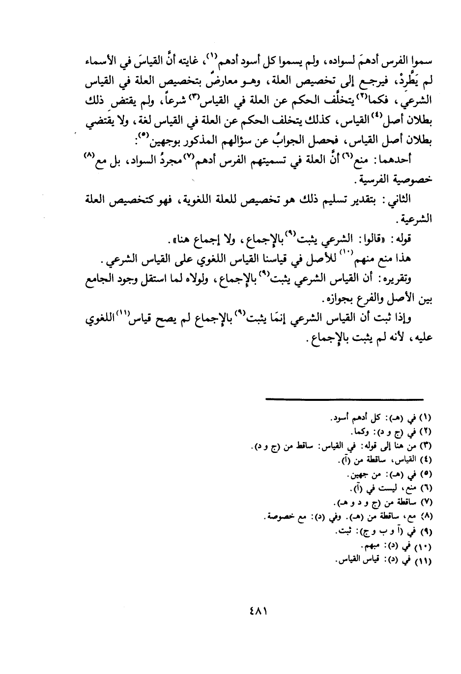 سَمَّوُا الْفَرَسَ أَدْهَمَ لِسَوَادِهِ، وَلَمْ يُسَمُّوا كُلَّ أَسْوَدَ أَدْهَمَ، غَايَتُهُ أَنَّ الْقِيَاسَ فِي الْأَسْمَاءِ لَمْ يَطَّرِدْ، فَيَرْجِعُ إِلَى تَخْصِيصِ الْعِلَّةِ، وَهُوَ مُعَارَضٌ بِتَخْصِيصِ الْعِلَّةِ فِي الْقِيَاسِ الشَّرْعِيِّ، فَكَمَا يَتَخَلَّفُ الْحُكْمُ عَنِ الْعِلَّةِ فِي الْقِيَاسِ شَرْعًا، وَلَمْ يَقْتَضِ ذَلِكَ بُطْلَانَ أَصْلِ الْقِيَاسِ، كَذَلِكَ يَتَخَلَّفُ الْحُكْمُ عَنِ الْعِلَّةِ فِي الْقِيَاسِ لُغَةً، وَلَا يَقْتَضِي بُطْلَانَ أَصْلِ الْقِيَاسِ، فَحَصَلَ الْجَوَابُ عَنْ سُؤَالِهِمُ الْمَذْكُورِ بِوَجْهَيْنِ: