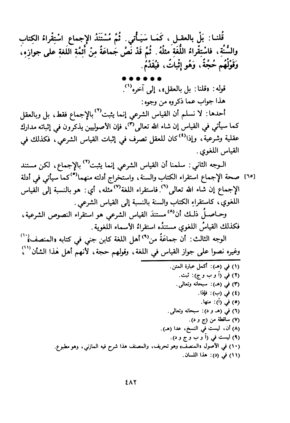 أَحَدُهَا: لَا نُسَلِّمُ أَنَّ الْقِيَاسَ الشَّرْعِيَّ إِنَّمَا يَثْبُتُ بِالْإِجْمَاعِ فَقَطْ، بَلْ وَبِالْعَقْلِ كَمَا سَيَأْتِي فِي الْقِيَاسِ إِنْ شَاءَ اللَّهُ تَعَالَى، فَإِنَّ الْأُصُولِيِّينَ يَذْكُرُونَ فِي إِثْبَاتِهِ مَدَارِكَ عَقْلِيَّةً وَشَرْعِيَّةً، وَإِذَا كَانَ لِلْعَقْلِ تَصَرُّفٌ فِي إِثْبَاتِ الْقِيَاسِ الشَّرْعِيِّ، فَكَذَلِكَ فِي الْقِيَاسِ اللُّغَوِيِّ.