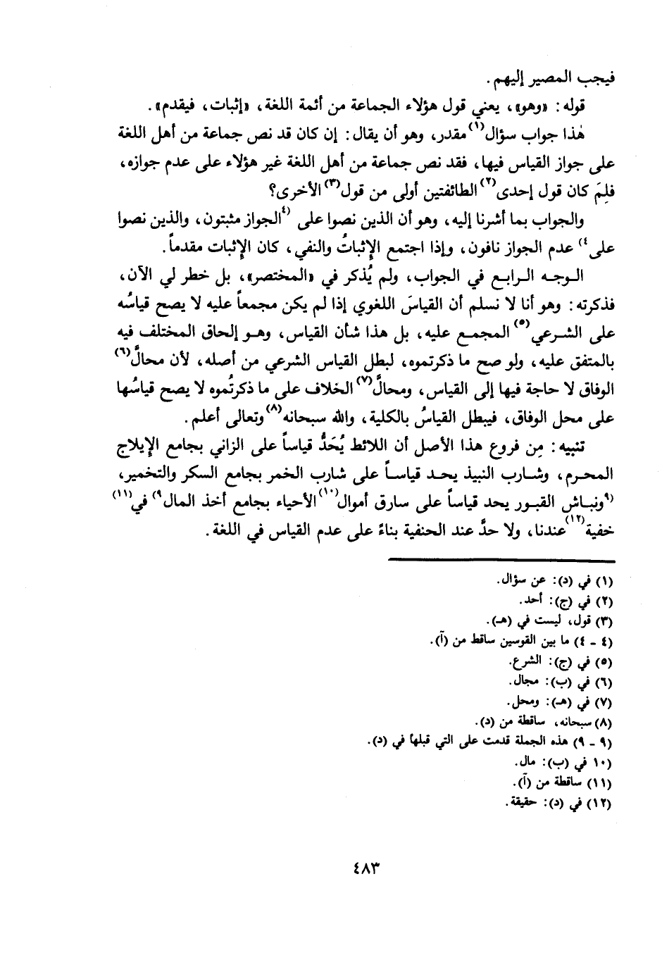 الْوَجْهُ الرَّابِعُ فِي الْجَوَابِ، وَلَمْ يُذْكَرْ فِي «الْمُخْتَصَرِ» ، بَلْ خَطَرَ لِيَ الْآنَ، فَذَكَرْتُهُ: وَهُوَ أَنَّا لَا نُسَلِّمُ أَنَّ الْقِيَاسَ اللُّغَوِيَّ إِذَا لَمْ يَكُنْ مُجْمَعًا عَلَيْهِ لَا يَصِحُّ قِيَاسُهُ عَلَى الشَّرْعِيِّ الْمُجْمَعِ عَلَيْهِ، بَلْ هَذَا شَأْنُ الْقِيَاسِ، وَهُوَ إِلْحَاقُ الْمُخْتَلَفِ فِيهِ بِالْمُتَّفَقِ عَلَيْهِ، وَلَوْ صَحَّ مَا ذَكَرْتُمُوهُ، لَبَطَلَ الْقِيَاسُ الشَّرْعِيُّ مِنْ أَصْلِهِ، لِأَنَّ مَحَالَّ الْوِفَاقِ لَا حَاجَةَ فِيهَا إِلَى الْقِيَاسِ، وَمَحَالَّ الْخِلَافِ عَلَى مَا ذَكَرْتُمُوهُ لَا يَصِحُّ قِيَاسُهَا عَلَى مَحَلِّ الْوِفَاقِ، فَيَبْطُلُ الْقِيَاسُ بِالْكُلِّيَّةِ، وَاللَّهُ سُبْحَانَهُ وَتَعَالَى أَعْلَمُ.