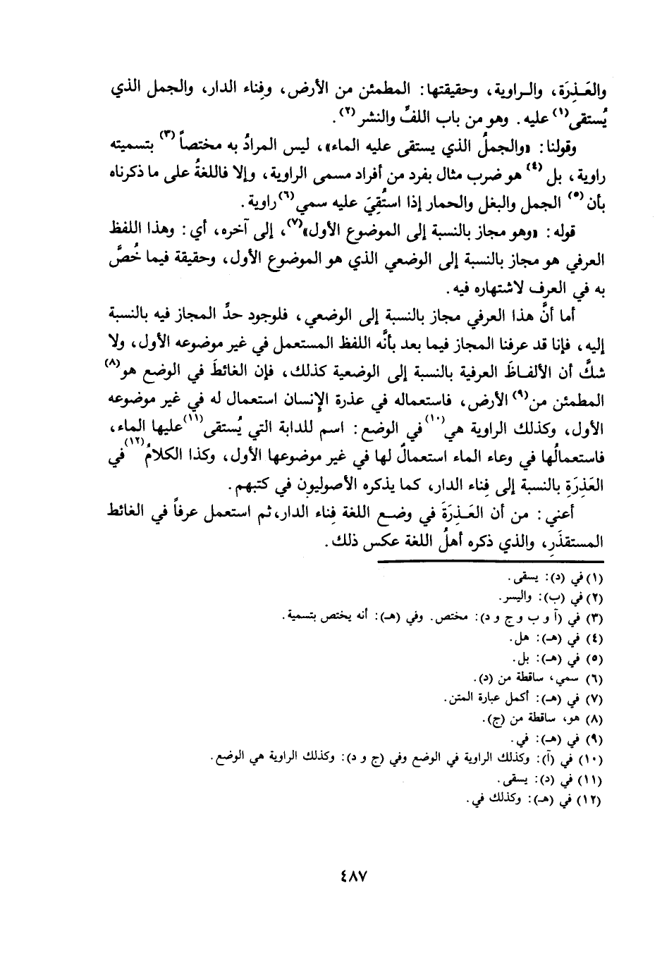 وَالْعَذِرَةِ، وَالرَّاوِيَةِ، وَحَقِيقَتُهَا: الْمُطْمَئِنُّ مِنَ الْأَرْضِ، وَفِنَاءُ الدَّارِ، وَالْجَمَلُ الَّذِي يُسْتَقَى عَلَيْهِ. وَهُوَ مِنْ بَابِ اللَّفِّ وَالنَّشْرِ.