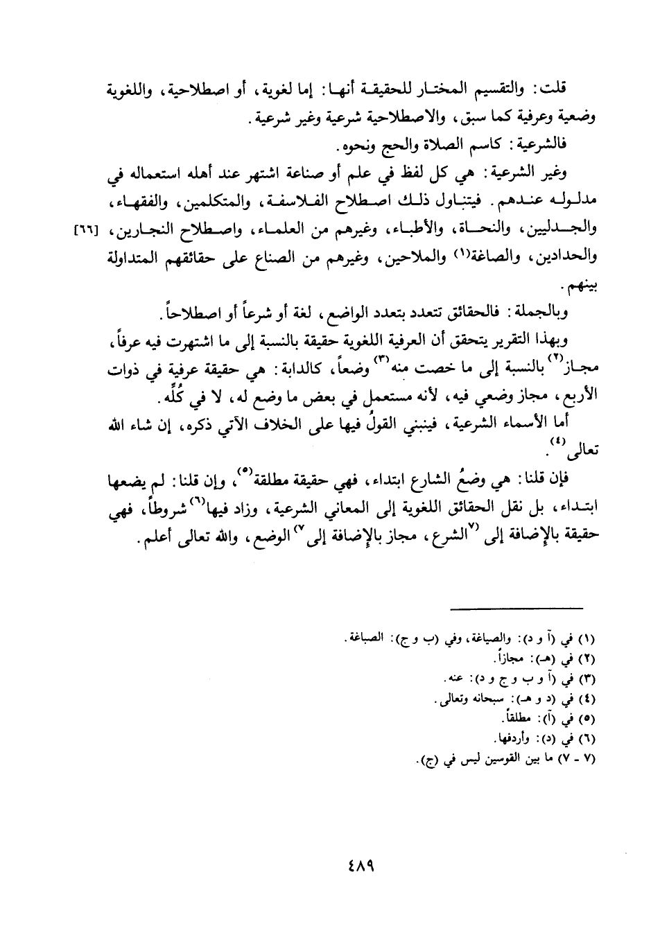 قُلْتُ: وَالتَّقْسِيمُ الْمُخْتَارُ لِلْحَقِيقَةِ أَنَّهَا: إِمَّا لُغَوِيَّةٌ، أَوِ اصْطِلَاحِيَّةٌ، وَاللُّغَوِيَّةُ وَضْعِيَّةٌ وَعُرْفِيَّةٌ كَمَا سَبَقَ، وَالِاصْطِلَاحِيَّةُ شَرْعِيَّةٌ وَغَيْرُ شَرْعِيَّةٍ.
