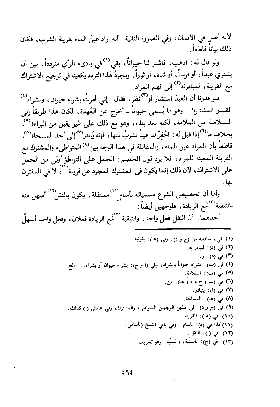 فَلَوْ قَدَّرْنَا أَنَّ الْعَبْدَ اسْتَشَارَ أَوْ نَظَرَ، فَقَالَ: إِنِّي أُمِرْتُ بِشِرَاءِ حَيَوَانٍ، وَبِشِرَاءِ الْقَدْرِ الْمُشْتَرَكِ - وَهُوَ مَا يُسَمَّى حَيَوَانًا - أُخْرِجَ عَنِ الْعُهْدَةِ، لَكَانَ هَذَا طَرِيقًا إِلَى السَّلَامَةِ مِنَ الْمَلَامَةِ، لَكِنَّهُ بَعْدَ بُطْءٍ، وَهُوَ مَعَ ذَلِكَ عَلَى غَيْرِ يَقِينٍ مِنَ الْبَرَاءَةِ، بِخِلَافِ مَا إِذَا قِيلَ لَهُ: احْفِرْ لَنَا عَيْنًا نَشْرَبْ مِنْهَا، فَإِنَّهُ يُبَادِرُ إِلَى أَخْذِ الْمِسْحَاةِ، قَاطِعًا بِأَنَّ الْمُرَادَ عَيْنُ الْمَاءِ، وَالْمُقَابَلَةُ فِي هَذَا الْوَجْهِ بَيْنَ الْمُتَوَاطِئِ وَالْمُشْتَرَكِ مَعَ الْقَرِينَةِ الْمُعَيَّنَةِ لِلْمُرَادِ، فَلَا يَرُدُّ قَوْلَ الْخَصْمِ: الْحَمْلُ عَلَى التَّوَاطُؤِ أَوْلَى مِنَ الْحَمْلِ عَلَى الِاشْتِرَاكِ، لِأَنَّ ذَلِكَ إِنَّمَا يَكُونُ فِي الْمُشْتَرَكِ الْمُجَرَّدِ عَنْ قَرِينَةٍ، لَا فِي الْمُقْتَرِنِ بِهَا.