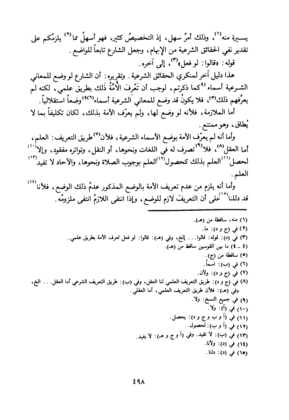 هَذَا دَلِيلٌ آخَرُ لِمُنْكِرِي الْحَقَائِقِ الشَّرْعِيَّةِ. وَتَقْرِيرُهُ: أَنَّ الشَّارِعَ لَوْ وَضَعَ لِلْمَعَانِي الشَّرْعِيَّةِ أَسْمَاءً كَمَا ذَكَرْتُمْ، لَوَجَبَ أَنْ تُعَرَّفَ الْأُمَّةُ ذَلِكَ بِطَرِيقٍ عِلْمِيٍّ، لَكِنَّهُ لَمْ يُعَرِّفْهُمْ ذَلِكَ، فَلَا يَكُونُ قَدْ وَضَعَ لِلْمَعَانِي الشَّرْعِيَّةِ أَسْمَاءً وَضْعًا اسْتِقْلَالِيًّا.