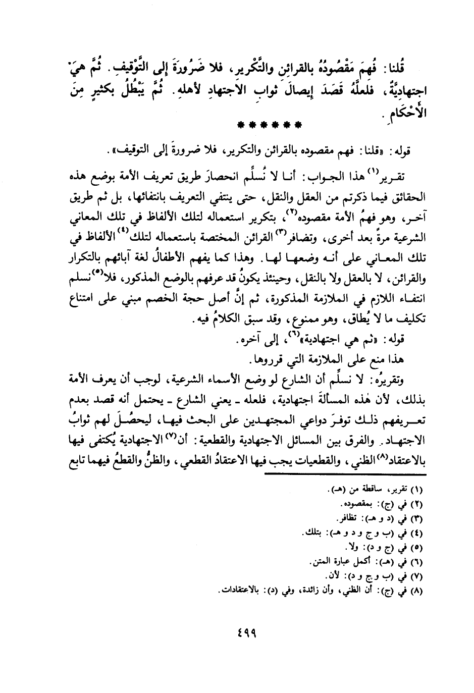 وَتَقْرِيرُهُ: لَا نُسَلِّمُ أَنَّ الشَّارِعَ لَوْ وَضَعَ الْأَسْمَاءَ الشَّرْعِيَّةَ، لَوَجَبَ أَنْ يُعَرِّفَ الْأُمَّةَ بِذَلِكَ، لِأَنَّ هَذِهِ الْمَسْأَلَةَ اجْتِهَادِيَّةٌ، فَلَعَلَّهُ - يَعْنِي الشَّارِعَ - يَحْتَمِلُ أَنَّهُ قَصَدَ بِعَدَمِ تَعْرِيفِهِمْ ذَلِكَ تَوَفُّرَ دَوَاعِي الْمُجْتَهِدِينَ عَلَى الْبَحْثِ فِيهَا، لِيَحْصُلَ لَهُمْ ثَوَابُ الِاجْتِهَادِ. وَالْفَرْقُ بَيْنَ الْمَسَائِلِ الِاجْتِهَادِيَّةِ وَالْقَطْعِيَّةِ: أَنَّ الِاجْتِهَادِيَّةَ يُكْتَفَى فِيهَا بِالِاعْتِقَادِ الظَّنِّيِّ، وَالْقَطْعِيَّاتِ يَجِبُ فِيهَا الِاعْتِقَادُ الْقَطْعِيُّ، وَالظَّنُّ وَالْقَطْعُ فِيهِمَا تَابِعٌ
