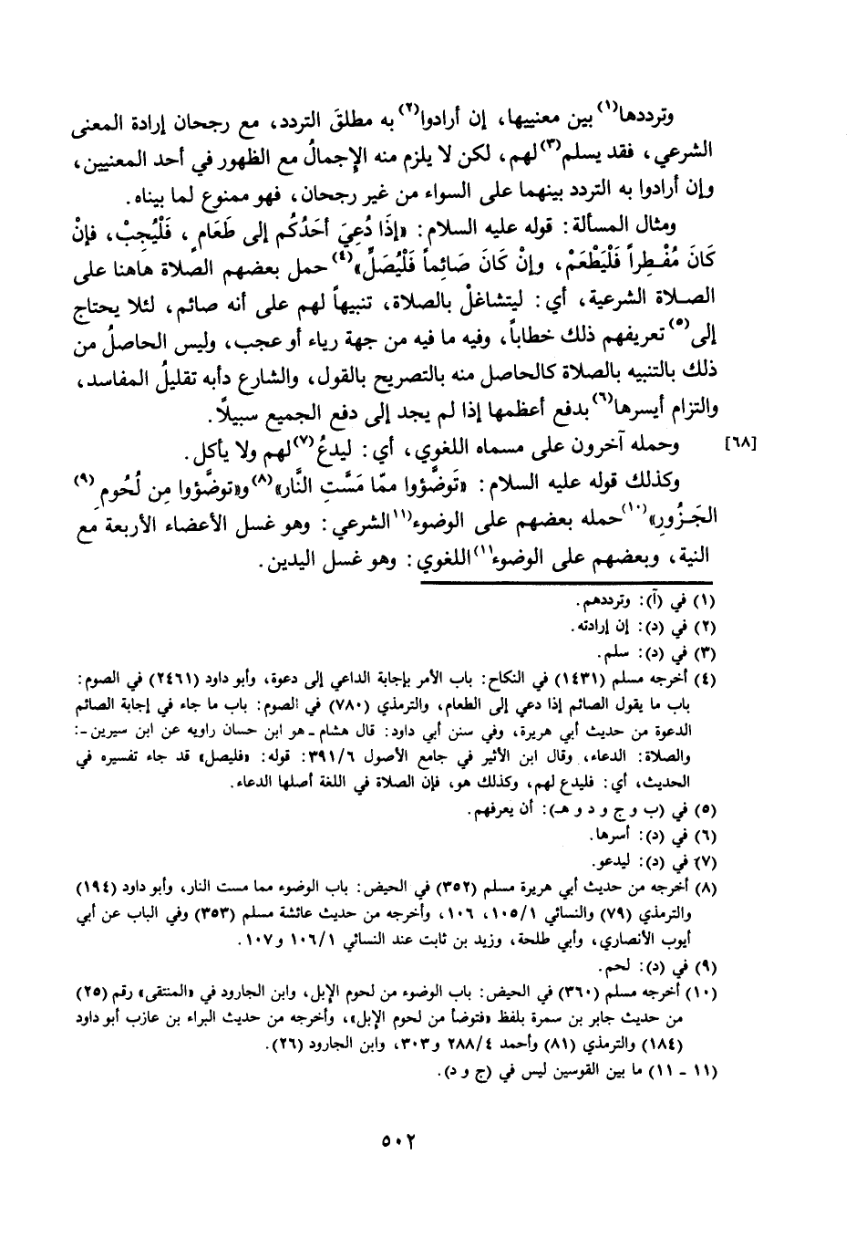 وَكَذَلِكَ قَوْلُهُ عَلَيْهِ السَّلَامُ: تَوَضَّئُوا مِمَّا مَسَّتِ النَّارُ وَتَوَضَّئُوا مِنْ لُحُومِ الْجَزُورِ حَمَلَهُ بَعْضُهُمْ عَلَى الْوُضُوءِ الشَّرْعِيِّ: وَهُوَ غَسْلُ الْأَعْضَاءِ الْأَرْبَعَةِ مَعَ النِّيَّةِ، وَبَعْضُهُمْ عَلَى الْوُضُوءِ اللُّغَوِيِّ: وَهُوَ غَسْلُ الْيَدَيْنِ.