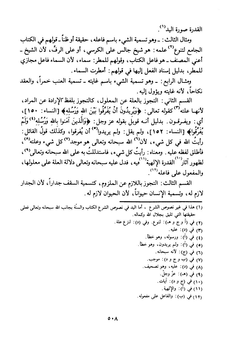 الْقِسْمُ الثَّانِي: التَّجَوُّزُ بِالْعِلَّةِ عَنِ الْمَعْلُولِ، كَالتَّجَوُّزِ بِلَفْظِ الْإِرَادَةِ عَنِ الْمُرَادِ، لِأَنَّهَا عِلَّتُهُ كَقَوْلِهِ تَعَالَى: {وَيُرِيدُونَ أَنْ يُفَرِّقُوا بَيْنَ اللَّهِ وَرُسُلِهِ} [النِّسَاءِ: 150] ، أَيْ: وَيُفَرِّقُونَ. بِدَلِيلِ أَنَّهُ قُوبِلَ بِقَوْلِهِ عَزَّ وَجَلَّ: {وَالَّذِينَ آمَنُوا بِاللَّهِ وَرُسُلِهِ وَلَمْ يُفَرِّقُوا} [النِّسَاءِ: 152] ، وَلَمْ يَقُلْ: وَلَمْ يُرِيدُوا أَنْ يُفَرِّقُوا، وَكَذَلِكَ قَوْلُ الْقَائِلِ: رَأَيْتُ اللَّهَ فِي كُلِّ شَيْءٍ، لِأَنَّ اللَّهَ سُبْحَانَهُ وَتَعَالَى هُوَ مُوجِدُ كُلِّ شَيْءٍ وَعِلَّتُهُ، فَأَطْلَقَ لَفْظَهُ عَلَيْهِ. وَمَعْنَاهُ: رَأَيْتُ كُلَّ شَيْءٍ، فَاسْتَدْلَلْتُ بِهِ عَلَى اللَّهِ سُبْحَانَهُ وَتَعَالَى، لِظُهُورِ آثَارِ الْقُدْرَةِ الْإِلَهِيَّةِ فِيهِ، فَدَلَّ عَلَيْهِ سُبْحَانَهُ وَتَعَالَى دَلَالَةَ الْعِلَّةِ عَلَى مَعْلُولِهَا، وَالْمَفْعُولِ عَلَى فَاعِلِهِ.