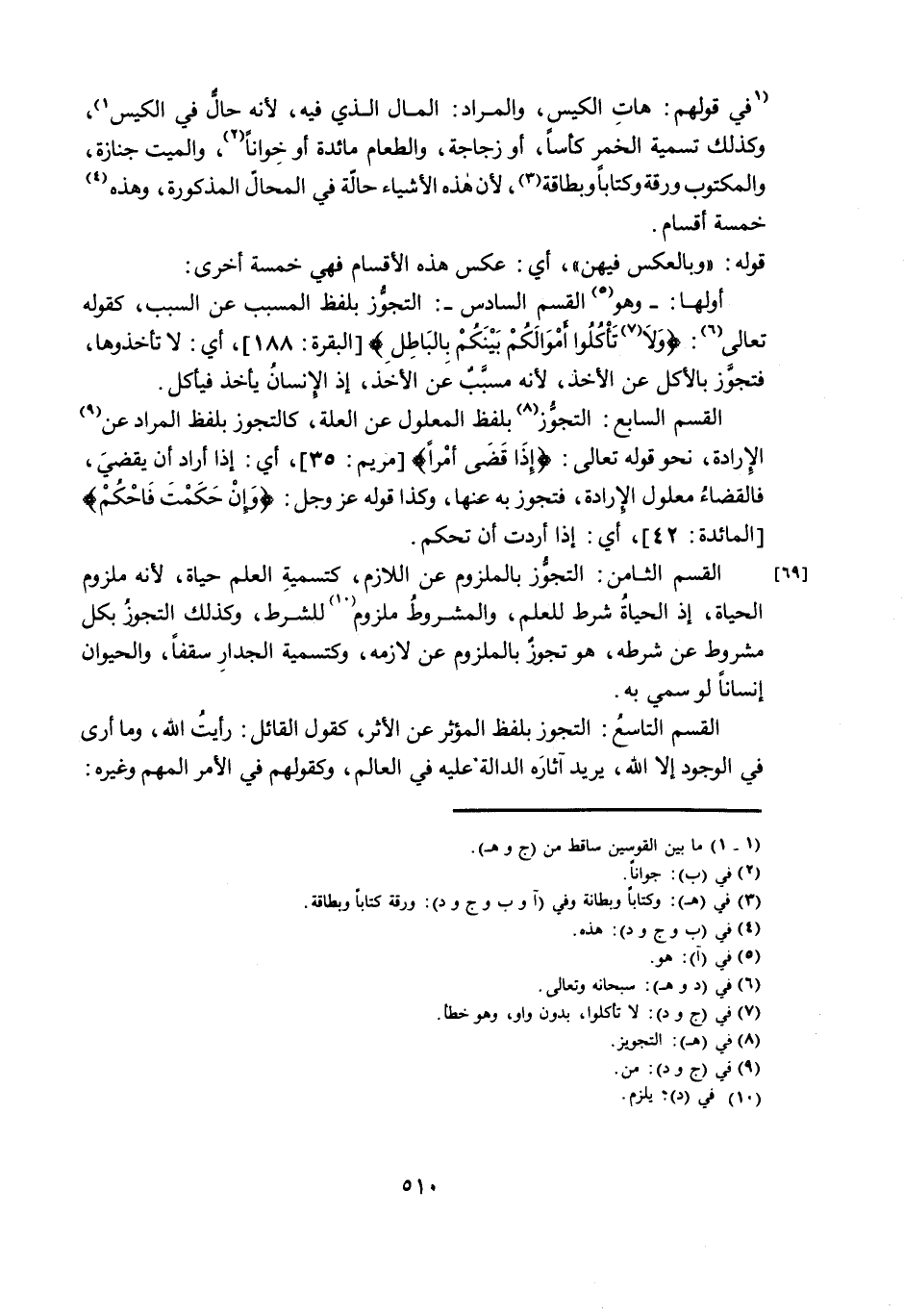 الْقِسْمُ الثَّامِنُ: التَّجَوُّزُ بِالْمَلْزُومِ عَنِ اللَّازِمِ، كَتَسْمِيَةِ الْعِلْمِ حَيَاةً، لِأَنَّهُ مَلْزُومُ الْحَيَاةِ، إِذِ الْحَيَاةُ شَرْطٌ لِلْعِلْمِ، وَالْمَشْرُوطُ مَلْزُومٌ لِلشَّرْطِ، وَكَذَلِكَ التَّجَوُّزُ بِكُلِّ مَشْرُوطٍ عَنْ شَرْطِهِ، هُوَ تَجَوُّزٌ بِالْمَلْزُومِ عَنْ لَازِمِهِ، وَكَتَسْمِيَةِ الْجِدَارِ سَقْفًا، وَالْحَيَوَانِ إِنْسَانًا لَوْ سُمِّيَ بِهِ.