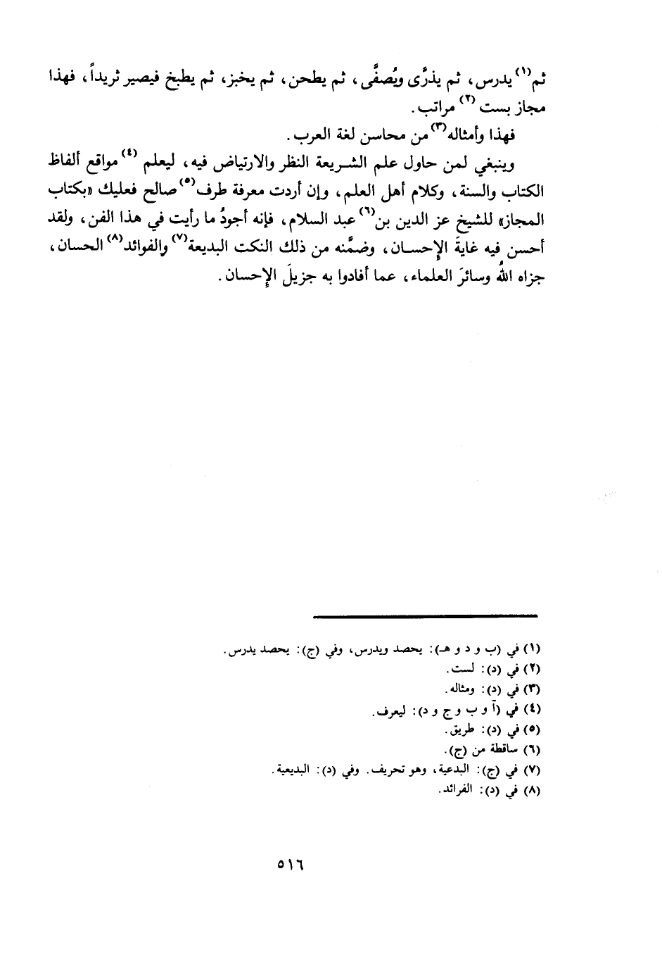 وَيَنْبَغِي لِمَنْ حَاوَلَ عِلْمَ الشَّرِيعَةِ النَّظَرُ وَالِارْتِيَاضُ فِيهِ، لِيَعْلَمَ مَوَاقِعَ أَلْفَاظِ الْكِتَابِ وَالسُّنَّةِ، وَكَلَامِ أَهْلِ الْعِلْمِ، وَإِنْ أَرَدْتَ مَعْرِفَةَ طَرَفٍ صَالِحٍ فَعَلَيْكَ «بِكِتَابِ الْمَجَازِ» لِلشَّيْخِ عِزِّ الدِّينِ بْنِ عَبْدِ السَّلَامِ، فَإِنَّهُ أَجْوَدُ مَا رَأَيْتُ فِي هَذَا الْفَنِّ، وَلَقَدْ أَحْسَنَ فِيهِ غَايَةَ الْإِحْسَانِ، وَضَمَّنَهُ مِنْ ذَلِكَ النُّكَتَ الْبَدِيعَةَ وَالْفَوَائِدَ الْحِسَانَ، جَزَاهُ اللَّهُ وَسَائِرَ الْعُلَمَاءِ، عَمَّا أَفَادُوا بِهِ جَزِيلَ الْإِحْسَانِ.
