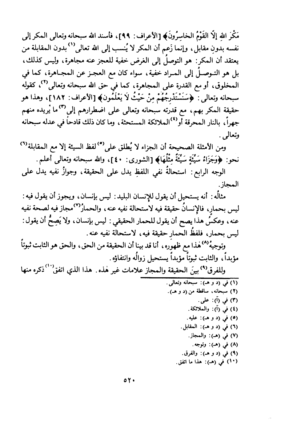 مَكْرَ اللَّهِ إِلَّا الْقَوْمُ الْخَاسِرُونَ [الْأَعْرَافِ: 99] ، فَأَسْنَدَ اللَّهُ سُبْحَانَهُ وَتَعَالَى الْمَكْرَ إِلَى نَفْسِهِ بِدُونِ مُقَابِلٍ، وَإِنَّمَا زَعَمَ أَنَّ الْمَكْرَ لَا يُنْسَبُ إِلَى اللَّهِ تَعَالَى بِدُونِ الْمُقَابَلَةِ مَنْ يَعْتَقِدُ أَنَّ الْمَكْرَ: هُوَ التَّوَصُّلُ إِلَى الْغَرَضِ خُفْيَةً لِلْعَجْزِ عَنْهُ مُجَاهَرَةً، وَلَيْسَ كَذَلِكَ، بَلْ هُوَ التَّوَصُّلُ إِلَى الْمُرَادِ خُفْيَةً، سَوَاءٌ كَانَ مَعَ الْعَجْزِ عَنِ الْمُجَاهَرَةِ، كَمَا فِي الْمَخْلُوقِ، أَوْ مَعَ الْقُدْرَةِ عَلَى الْمُجَاهَرَةِ، كَمَا فِي حَقِّ اللَّهِ سُبْحَانَهُ وَتَعَالَى، كَقَوْلِهِ سُبْحَانَهُ وَتَعَالَى: {سَنَسْتَدْرِجُهُمْ مِنْ حَيْثُ لَا يَعْلَمُونَ} [الْأَعْرَافِ: 182] ، وَهَذَا هُوَ حَقِيقَةُ الْمَكْرِ بِهِمْ، مَعَ قُدْرَتِهِ سُبْحَانَهُ وَتَعَالَى عَلَى اضْطِرَارِهِمْ إِلَى مَا يُرِيدُهُ مِنْهُمْ جَهْرًا، بِالنَّارِ الْمُحْرِقَةِ أَوِ الْمَلَائِكَةِ الْمُسْتَحَثَّةِ، وَمَا كَانَ ذَلِكَ قَادِحًا فِي عَدْلِهِ سُبْحَانَهُ وَتَعَالَى.