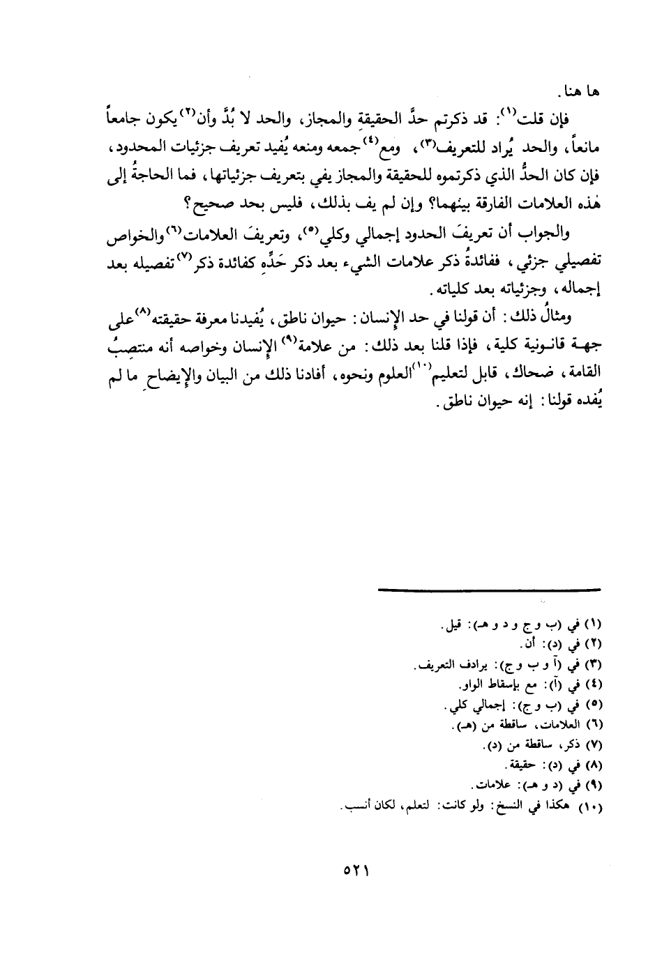 وَمِثَالُ ذَلِكَ: أَنَّ قَوْلَنَا فِي حَدِّ الْإِنْسَانِ: حَيَوَانٌ نَاطِقٌ، يُفِيدُنَا مَعْرِفَةَ حَقِيقَتِهِ عَلَى جِهَةٍ قَانُونِيَّةٍ كُلِّيَّةٍ، فَإِذَا قُلْنَا بَعْدَ ذَلِكَ: مِنْ عَلَامَةِ الْإِنْسَانِ وَخَوَاصِّهِ أَنَّهُ مُنْتَصِبُ الْقَامَةِ، ضَحَّاكٌ، قَابِلٌ لِتَعْلِيمِ الْعُلُومِ وَنَحْوِهِ، أَفَادَنَا ذَلِكَ مِنَ الْبَيَانِ وَالْإِيضَاحِ مَا لَمْ يُفِدْهُ قَوْلُنَا: إِنَّهُ حَيَوَانٌ نَاطِقٌ.