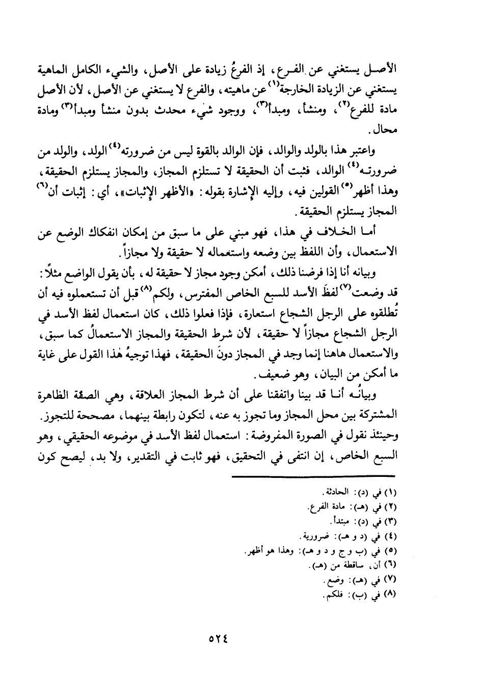 الْأَصْلَ يَسْتَغْنِي عَنِ الْفَرْعِ، إِذِ الْفَرْعُ زِيَادَةٌ عَلَى الْأَصْلِ، وَالشَّيْءُ الْكَامِلُ الْمَاهِيَّةِ يَسْتَغْنِي عَنِ الزِّيَادَةِ الْخَارِجَةِ عَنْ مَاهِيَّتِهِ، وَالْفَرْعُ لَا يَسْتَغْنِي عَنِ الْأَصْلِ، لِأَنَّ الْأَصْلَ مَادَّةٌ لِلْفَرْعِ، وَمَنْشَأٌ، وَمَبْدَأٌ، وَوُجُودُ شَيْءٍ مُحْدَثٍ بِدُونِ مَنْشَأٍ وَمَبْدَأٍ وَمَادَّةٍ مُحَالٌ.