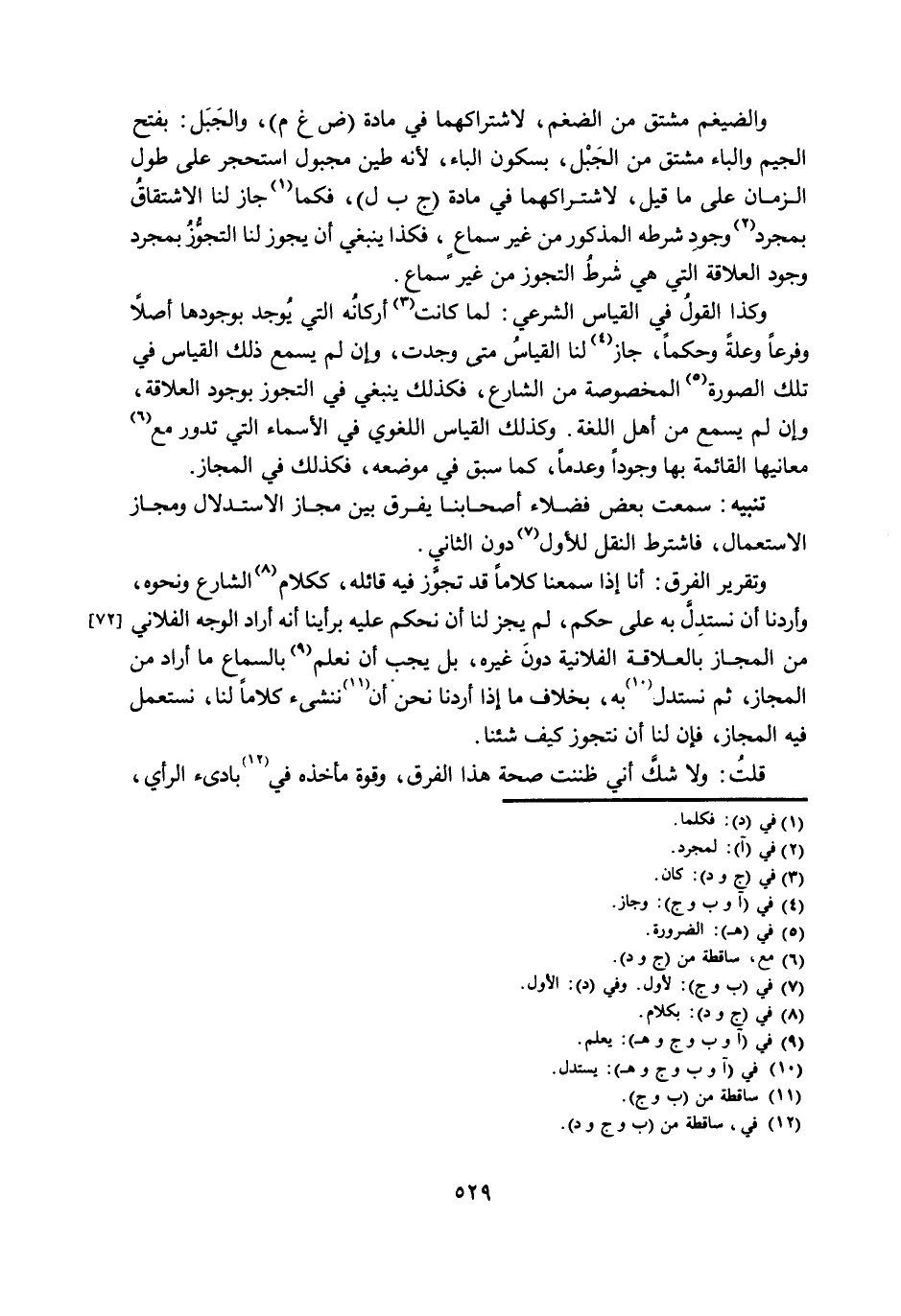 وَكَذَا الْقَوْلُ فِي الْقِيَاسِ الشَّرْعِيِّ: لَمَّا كَانَتْ أَرْكَانُهُ الَّتِي يُوجَدُ بِوُجُودِهَا أَصْلًا وَفَرْعًا وَعِلَّةً وَحُكْمًا، جَازَ لَنَا الْقِيَاسُ مَتَى وُجِدَتْ، وَإِنْ لَمْ يُسْمَعْ ذَلِكَ الْقِيَاسُ فِي تِلْكَ الصُّورَةِ الْمَخْصُوصَةِ مِنَ الشَّارِعِ، فَكَذَلِكَ يَنْبَغِي فِي التَّجَوُّزِ بِوُجُودِ الْعِلَاقَةِ، وَإِنْ لَمْ يُسْمَعْ مِنْ أَهْلِ اللُّغَةِ. وَكَذَلِكَ الْقِيَاسُ اللُّغَوِيُّ فِي الْأَسْمَاءِ الَّتِي تَدُورُ مَعَ مَعَانِيهَا الْقَائِمَةِ بِهَا وُجُودًا وَعَدَمًا، كَمَا سَبَقَ فِي مَوْضِعِهِ، فَكَذَلِكَ فِي الْمَجَازِ.