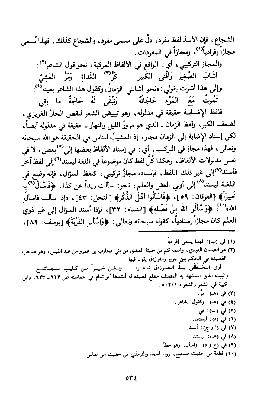 فَلَفْظُ الْإِشَابَةِ حَقِيقَةٌ فِي مَدْلُولِهِ، وَهُوَ تَبْيِيضُ الشَّعْرِ لِنَقْصِ الْحَارِّ الْغَرِيزِيِّ، لِضَعْفِ الْكِبَرِ، وَلَفْظُ الزَّمَانِ - الَّذِي هُوَ مُرُورُ اللَّيْلِ وَالنَّهَارِ - حَقِيقَةٌ فِي مَدْلُولِهِ أَيْضًا، لَكِنَّ إِسْنَادَ الْإِشَابَةِ إِلَى الزَّمَانِ مَجَازٌ، إِذِ الْمُشَيِّبُ لِلنَّاسِ فِي الْحَقِيقَةِ هُوَ اللَّهُ سُبْحَانَهُ وَتَعَالَى، فَهَذَا مَجَازٌ فِي التَّرْكِيبِ، أَيْ: فِي إِسْنَادِ الْأَلْفَاظِ بَعْضِهَا إِلَى بَعْضٍ، لَا فِي نَفْسِ مَدْلُولَاتِ الْأَلْفَاظِ، وَهَكَذَا كُلُّ لَفْظٍ كَانَ مَوْضُوعًا فِي اللُّغَةِ لِيُسْنَدَ إِلَى لَفْظٍ آخَرَ فَأُسْنِدَ إِلَى غَيْرِ ذَلِكَ اللَّفْظِ، فَإِسْنَادُهُ مَجَازٌ تَرْكِيبِيٌّ، كَلَفْظِ السُّؤَالِ، فَإِنَّهُ وُضِعَ فِي اللُّغَةِ لِيُسْنَدَ إِلَى أُولِي الْعَقْلِ وَالْعِلْمِ، نَحْوَ: سَأَلْتُ زَيْدًا عَنْ كَذَا، {فَاسْأَلْ بِهِ خَبِيرًا} [الْفُرْقَانِ: 59] ، {فَاسْأَلُوا أَهْلَ الذِّكْرِ} [النَّحْلِ: 43] ، إِذَا سَأَلْتَ فَاسْأَلِ اللَّهَ، {وَاسْأَلُوا اللَّهَ مِنْ فَضْلِهِ} [النِّسَاءِ: 32] ، فَإِذَا أُسْنِدَ السُّؤَالُ إِلَى غَيْرِ ذَوِي الْعِلْمِ كَانَ مَجَازًا إِسْنَادِيًّا، كَقَوْلِهِ سُبْحَانَهُ وَتَعَالَى: {وَاسْأَلِ الْقَرْيَةَ} [يُوسُفَ: 82] ،