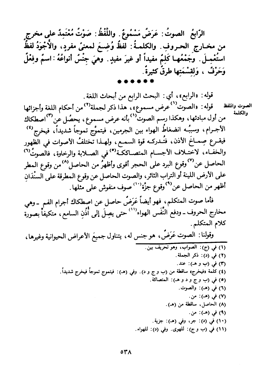 الرَّابِعُ الصَّوْتُ: عَرَضٌ مَسْمُوعٌ. وَاللَّفْظُ: صَوْتٌ مُعْتَمِدٌ عَلَى مَخْرَجٍ مِنْ مَخَارِجِ الْحُرُوفِ. وَالْكَلِمَةُ: لَفْظٌ وُضِعَ لِمَعْنًى مُفْرَدٍ، وَالْأَجْوَدُ لَفْظٌ اسْتُعْمِلَ. وَجَمْعُهَا كَلِمٌ مُفِيدًا أَوْ غَيْرَ مُفِيدٍ. وَهِيَ جِنْسُ أَنْوَاعِهِ: اسْمٌ وَفِعْلٌ وَحَرْفٌ، وَلِقِسْمَتِهَا طُرُقٌ كَثِيرَةٌ.