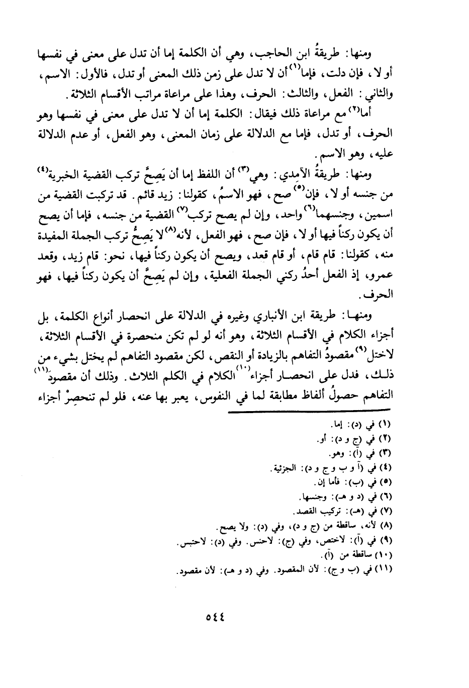 وَمِنْهَا: طَرِيقَةُ ابْنِ الْحَاجِبِ، وَهِيَ أَنَّ الْكَلِمَةَ إِمَّا أَنْ تَدُلَّ عَلَى مَعْنًى فِي نَفْسِهَا أَوْ لَا، فَإِنْ دَلَّتْ، فَإِمَّا أَنْ لَا تَدُلَّ عَلَى زَمَنِ ذَلِكَ الْمَعْنَى أَوْ تَدُلَّ، فَالْأَوَّلُ: الِاسْمُ، وَالثَّانِي: الْفِعْلُ، وَالثَّالِثُ: الْحَرْفُ، وَهَذَا عَلَى مُرَاعَاةِ مَرَاتِبِ الْأَقْسَامِ الثَّلَاثَةِ.