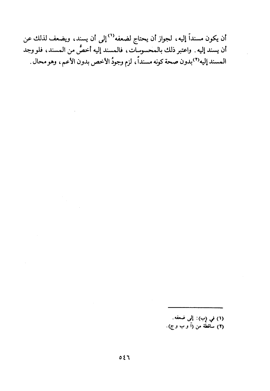 أَنْ يَكُونَ مُسْنَدًا إِلَيْهِ، لِجَوَازِ أَنْ يَحْتَاجَ لِضَعْفِهِ إِلَى أَنْ يُسْنَدَ، وَيَضْعُفَ لِذَلِكَ عَنْ أَنْ يُسْنَدَ إِلَيْهِ. وَاعْتُبِرَ ذَلِكَ بِالْمَحْسُوسَاتِ، فَالْمُسْنَدُ إِلَيْهِ أَخَصُّ مِنَ الْمُسْنَدِ، فَلَوْ وُجِدَ الْمُسْنَدُ إِلَيْهِ بِدُونِ صِحَّةِ كَوْنِهِ مُسْنَدًا، لَزِمَ وُجُودُ الْأَخَصِّ بِدُونِ الْأَعَمِّ، وَهُوَ مُحَالٌ.