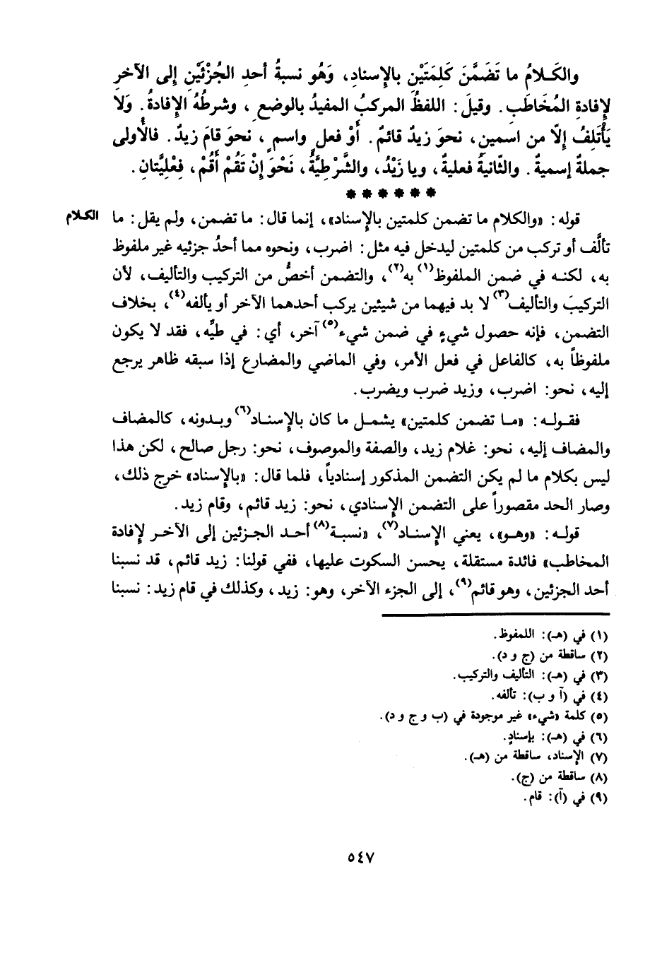 وَالْكَلَامُ مَا تَضَمَّنَ كَلِمَتَيْنِ بِالْإِسْنَادِ، وَهُوَ نِسْبَةُ أَحَدِ الْجُزْئَيْنِ إِلَى الْآخَرِ لِإِفَادَةِ الْمُخَاطَبِ. وَقِيلَ: اللَّفْظُ الْمُرَكَّبُ الْمُفِيدُ بِالْوَضْعِ، وَشَرْطُهُ الْإِفَادَةُ. وَلَا يَأْتَلِفُ إِلَّا مِنِ اسْمَيْنِ، نَحْوَ زَيْدٌ قَائِمٌ. أَوْ فِعْلٍ وَاسْمٍ، نَحْوَ قَامَ زَيْدٌ. فَالْأُولَى جُمْلَةٌ اسْمِيَّةٌ. وَالثَّانِيَةُ فِعْلِيَّةٌ، وَيَا زَيْدُ، وَالشَّرْطِيَّةُ، نَحْوَ إِنْ تَقُمْ أَقُمْ، فِعْلِيَّتَانِ.