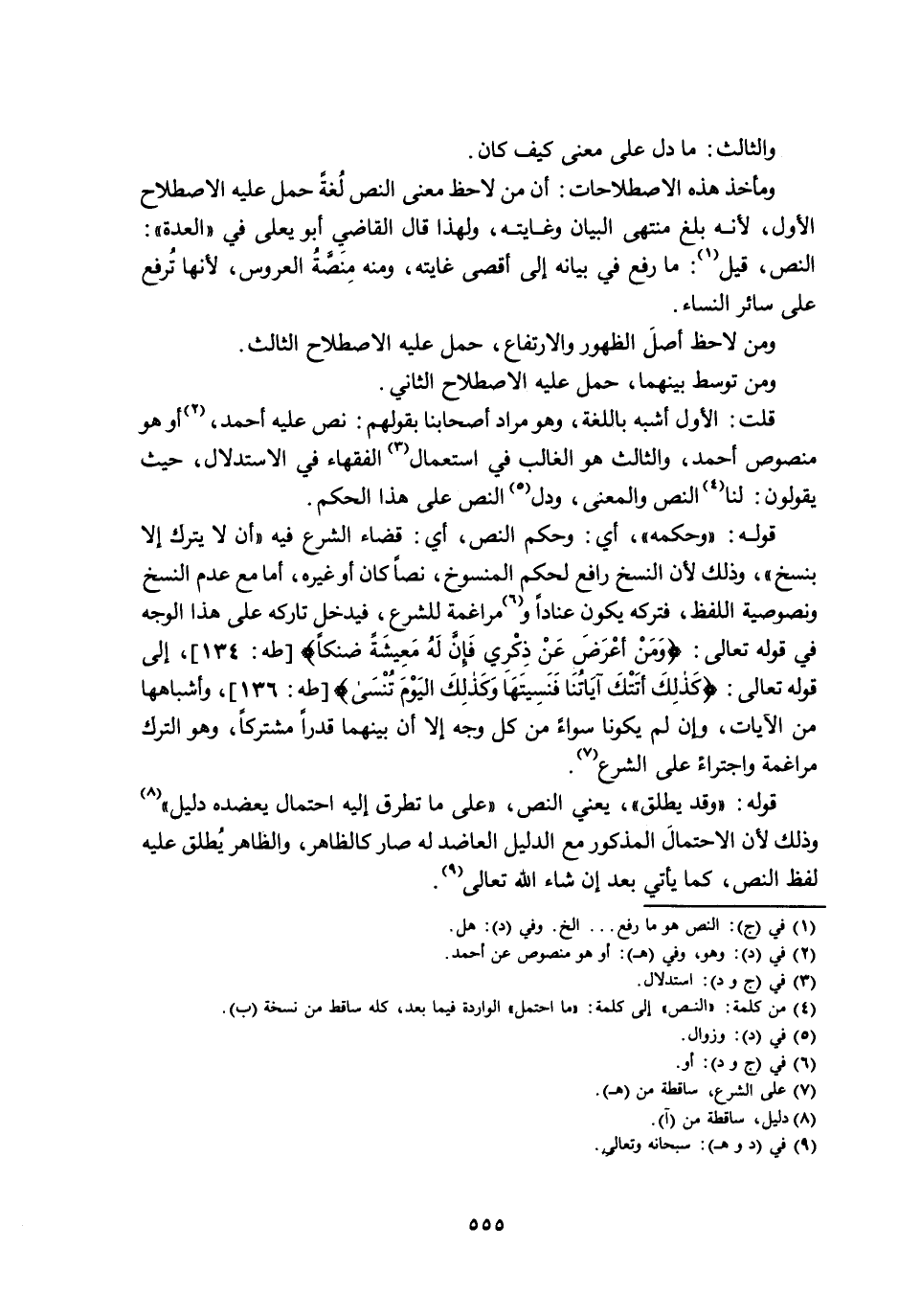 وَمَأْخَذُ هَذِهِ الِاصْطِلَاحَاتِ: أَنَّ مَنْ لَاحَظَ مَعْنَى النَّصِّ لُغَةً حَمَلَ عَلَيْهِ الِاصْطِلَاحَ الْأَوَّلَ، لِأَنَّهُ بَلَغَ مُنْتَهَى الْبَيَانِ وَغَايَتَهُ، وَلِهَذَا قَالَ الْقَاضِي أَبُو يَعْلَى فِي «الْعُدَّةِ» : النَّصُّ، قِيلَ: مَا رُفِعَ فِي بَيَانِهِ إِلَى أَقْصَى غَايَتِهِ، وَمِنْهُ مِنَصَّةُ الْعَرُوسِ، لِأَنَّهَا تُرْفَعُ عَلَى سَائِرِ النِّسَاءِ.