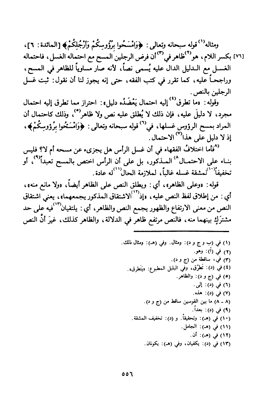 وَمِثَالُهُ قَوْلُهُ سُبْحَانَهُ وَتَعَالَى: {وَامْسَحُوا بِرُءُوسِكُمْ وَأَرْجُلَكُمْ} [الْمَائِدَةِ: 6] ، بِكَسْرِ اللَّامِ، هُوَ ظَاهِرٌ فِي أَنَّ فَرْضَ الرِّجْلَيْنِ الْمَسْحُ مَعَ احْتِمَالِهِ الْغَسْلَ، فَاحْتِمَالُهُ الْغَسْلَ مَعَ الدَّلِيلِ الدَّالِّ عَلَيْهِ يُسَمَّى نَصًّا، لِأَنَّهُ صَارَ مُسَاوِيًا لِلظَّاهِرِ فِي الْمَسْحِ، وَرَاجِحًا عَلَيْهِ، كَمَا تَقَرَّرَ فِي كُتُبِ الْفِقْهِ، حَتَّى إِنَّهُ يَجُوزُ لَنَا أَنْ نَقُولَ: ثَبَتَ غَسْلُ الرِّجْلَيْنِ بِالنَّصِّ.