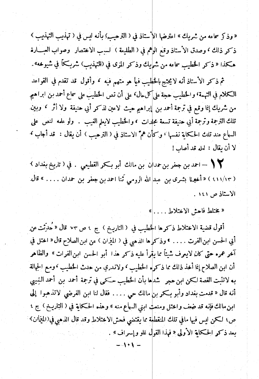ثم ذكر الأستاذ أنه لا يحتج بالخطيب فيما هو منهم فيه، وأقول قد تقدم في القواعد الكلام في التهمة، والخطيب حجة على كل حال، على أن نص الخطيب على سماع أحمد ابن إبراهيم من شريك إنما وقع في ترجمة أحمد بن إبراهيم حيث لا عين لذكر أبي حنيفة ولا أثر، وبين تلك الترجمة وترجمة أبي حنيفة تسعة مجلدات، والخطيب لا يعلم الغيب. ولو علمه لنص على السماع عند تلك الحكاية نفسها،وكأن هم الأستاذ في (الترحيب) أن يقال: قد أجاب، لا أن يقال: لعله قد أصاب!