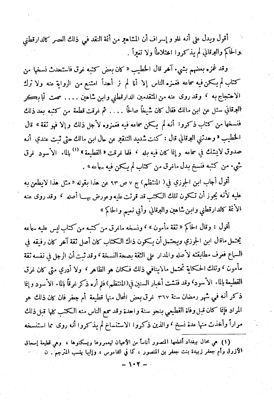 أقول: وقال الحاكم ((ثقة مأمون)) ونسخه ما غرق من كتبه من كتاب ليس عليه سماعه يحتمل ما قال ابن الجوزي ويحتمل أن يكون ذاك الكتاب كان أصل ثقة آخر كان رفيقه في السماع فعرف مطابقته لأصله والمدار على الثقة بصحة النسخة، وقد ثبت أن الرجل في نفسه ثقة مأمون، وتلك الحكاية تحتمل ما لا ينافي ذلك فكان هو الظاهر، ولا أدري متى غرق القطيعة بالماء والأسود، وقد فتشت أخبار السنين في (المنتظم) فلن أره ذكر غرقا بالماء السود وإنما ذكر أنه في شهر رمضان سنة 367 غرق بعض المحال منها قطيعة أم جعفر فإن كان ذلك هو المراد فإنما كان قبل وفاة القطيعي بنحو سنة واحدة وقد سمع الناس منه الكتب كلها قبل ذلك مراراً وأخذت منها عدة نسخ، والذين ذكروا الاستنساخ لم يذكروا أنه روى مما استنسخه
