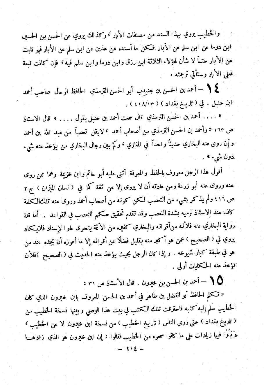 (( .... أحمد بن الحسن الترمذي قال سمعت أحمد بن حنبل يقول : قال الأستاذ ص163 (( وأحمد بن الحسن الترمذي من أصحاب أحمد ، لا يقل تعصباً من عبد الله بن أحمد وإن روى عنه البخاري حديثاً واحداً في المغازي ، وكم بين رجال البخاري من يؤخذ عنه شيء دون شيء )) .