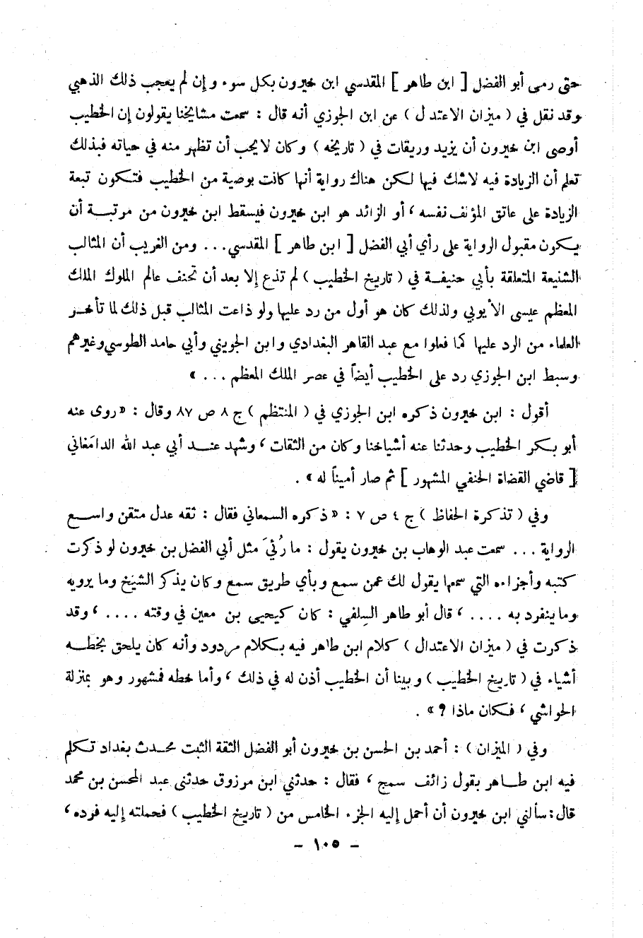 حتى رمى أبو الفضل [ ابن طاهر ] المقدسي ابن خيرون بكل سوء وإن لم يعجب ذلك الذهبي وقد نقل في ( ميزان الاعتدال ) عن ابن الجوزي أنه قال : سمعت مشايخنا يقولون إن الخطيب أوصى ابن خيرون أن يزيد وريقات في ( تاريخه ) وكان لا يحب أن تظهر منه في حياته فبذلك تعلم أن الزيادة فيه لا شك فيها لكن هناك رواية أنها كانت بوصية من الخطيب فتكون تبعة الزيادة على عاتق المؤلف نفسه ، أو الزائد هو ابن خيرون فيسقط ابن خيرون من مرتبة أن يكون مقبول الرواية على رأي أبي الفضل [ ابن طاهر ] المقدسي ... ومن الغريب أن المثالب الشنيعة المتعلقة بأبي حنيفة في ( تاريخ الخطيب ) لم تذع إلا بعد أن تحنف عالم الملوك الملك المعظم عيسى الأيوبي ولذلك كان هو أول من رد عليها ولو ذاعت المثالب قبل ذلك لما تأخر العلماء من الرد عليها كما فعلوا مع عبد القاهر البغدادي وابن الجويني وأبي حامد الطوسي وغيرهم وسبط ابن الجوزي رد على الخطيب أيضاً في عصر الملك المعظم ... ))