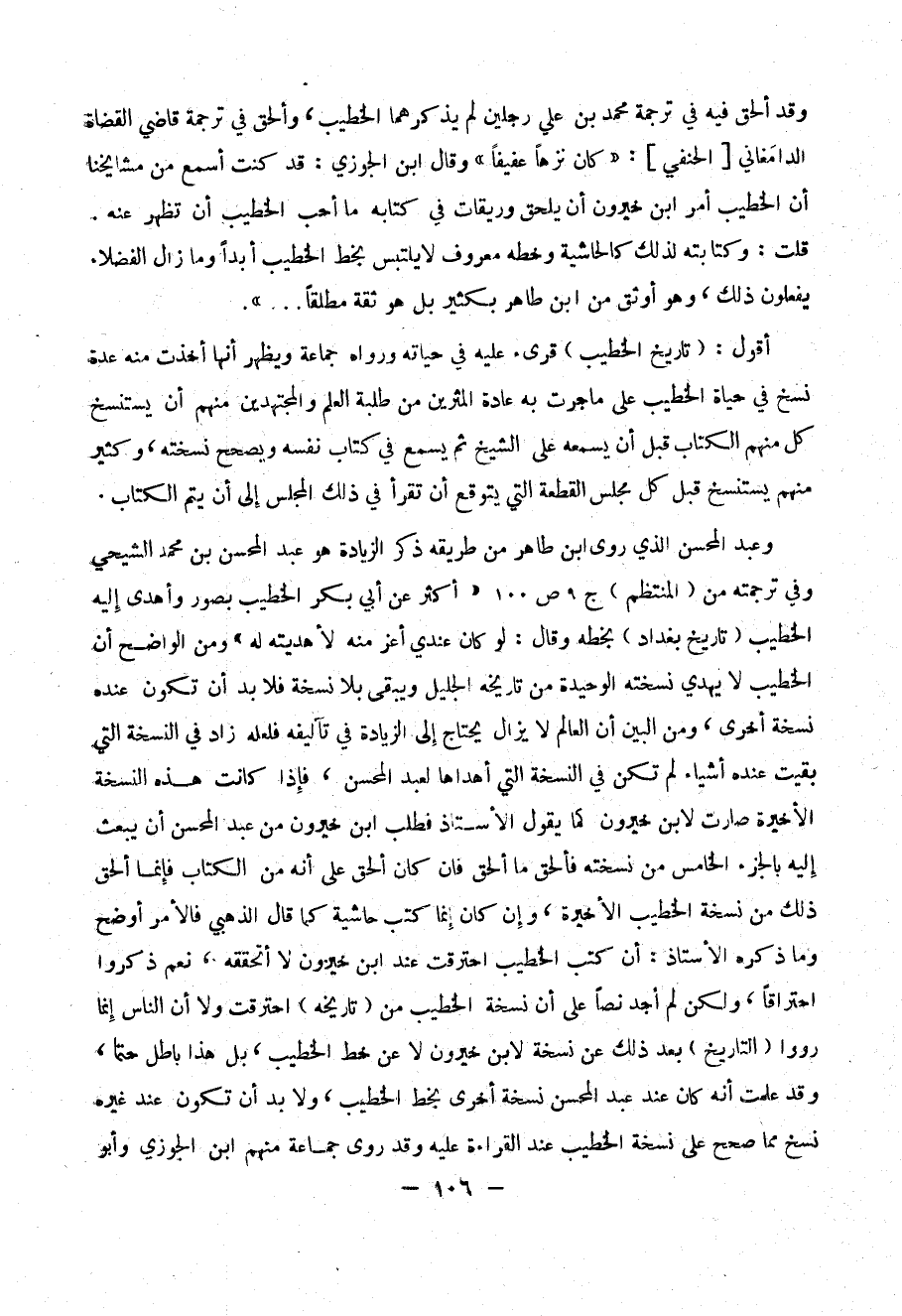وعبد المحسن الذي روى ابن طاهر من طريقه ذكر الزيادة هو عبد المحسن بن محمد الشيحي وفي ترجمته من ( المنتظم ) ج9 ص100 (( أكثر عن أبي بكر الخطيب بصور وأهدى إليه الخطيب ( تاريخ بغداد ) بخطه وقال : لو كان عندي أعز منه لأهديته له )) ومن الواضح أن الخطيب لا يهدي نسخته الوحيدة من تاريخه الجليل ويبقى بلا نسخة فلا بد أن تكون عنده أخرى ، ومن البين أن العالم لا يزال يحتاج إلى الزيادة في تأليفه فلعله زاد في النسخة التي بقيت عنده أشياء لم تكن في النسخة التي أهداها لعبد المحسن فإذا كانت هذه النسخة الأخيرة صارت لابن خيرون كما يقول الأستاذ فطلب ابن خيرون من عبد المحسن أن يبعث إليه بالجزء الخامس من نسخته فألحق ما ألحق فإن كان ألحق على أنه من الكتاب فإنما ألحق ذلك من نسخة الخطيب الأخيرة ، وإن كان إنما كتب حاشية كما قال الذهبي فالأمر أوضح وما ذكره الأستاذ : أن كتب الخطيب احترقت عند ابن خيرون لا أتحققه ، نعم ذكروا احتراقاً ، ولكن لم أجد نصاً على أن نسخة الخطيب من ( تاريخه ) احترقت ولا أن الناس إنما رووا ( التاريخ ) بعد ذلك عن نسخة لابن خيرون لا عن خط الخطيب بل هذا باطل حتماً ، وقد علمت أنه كان عند عبد المحسن نسخة أخرى بخط الخطيب ، ولا بد أن تكون عند غيره نسخ مما صحح على نسخة الخطيب عند القراءة عليه وقد روى جماعة منهم ابن الجوزي وأبو
