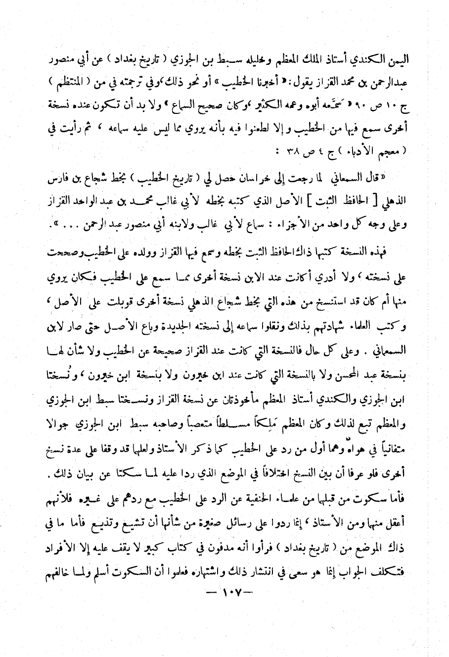 اليمن الكندي أستاذ الملك المعظم وخليله سبط بن الجوزي ( تاريخ بغداد ) عن أبي منصور عبد الرحمن بن محمد القزاز يقول : (( أخبرنا الخطيب )) أو نحو ذلك ، وفي ترجمته في من ( المنتظم ) ج 10 ص 90 (( سمعه أبوه وعمه الكثير ، وكان صحيح السماع )) ولا بد أن نكون عنده نسخة أخرى سمع فيها الخطيب وإلا لطعنوا فيه بأنه يروي مما ليس عليه سماعه ، ثم رأيت في ( معجم الأدباء ) ج4 ص 38 :