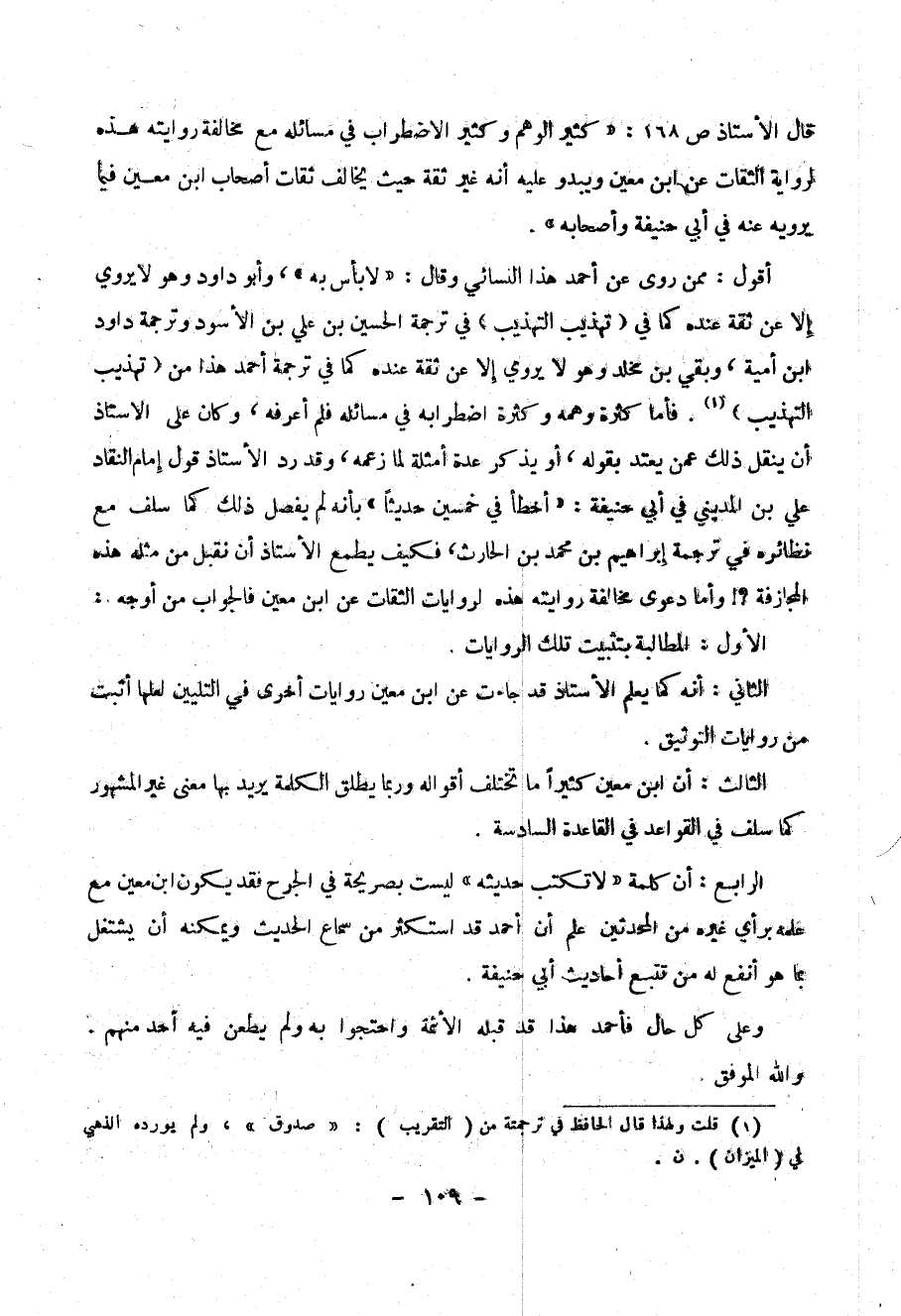 أقول : ممن روى عن أحمد هذا النسائي وقال : (( لابأس به )) وأبو داود وهو لا يروي إلا عن ثقة عنده كما في ( تهذيب التهذيب ) في ترجمة الحسين بن علي بن الأسود وترجمة داود بن أمية ، وبقي بن مخلد وهو لا يروي إلا عن ثقة عنده كما في ترجمة أحمد هذا من ( تهذيب التهذيب ) (1) . فأما كثرة وهمه وكثرة اضطرابه في مسائله فلم أعرفه ، وكان على الأستاذ أن ينقل ذلك عمن يعتد بقوله ، أو يذكر عدة أمثلة لما زعمه ، وقد رد الأستاذ قول إمام النقاد علي بن المديني في أبي حنيفة : (( أخطأ في خمسين حديثاً )) بأنه لم يفصل ذلك كما سلف مع نظائره في ترجمة إبراهيم بن محمد بن الحارث ، فكيف يطمع الأستاذ أن نقبل من مثله هذه المجازفة ؟! وأما دعوى مخالفة روايته هذه لروايات الثقات عن ابن معين فالجواب من أوجه :