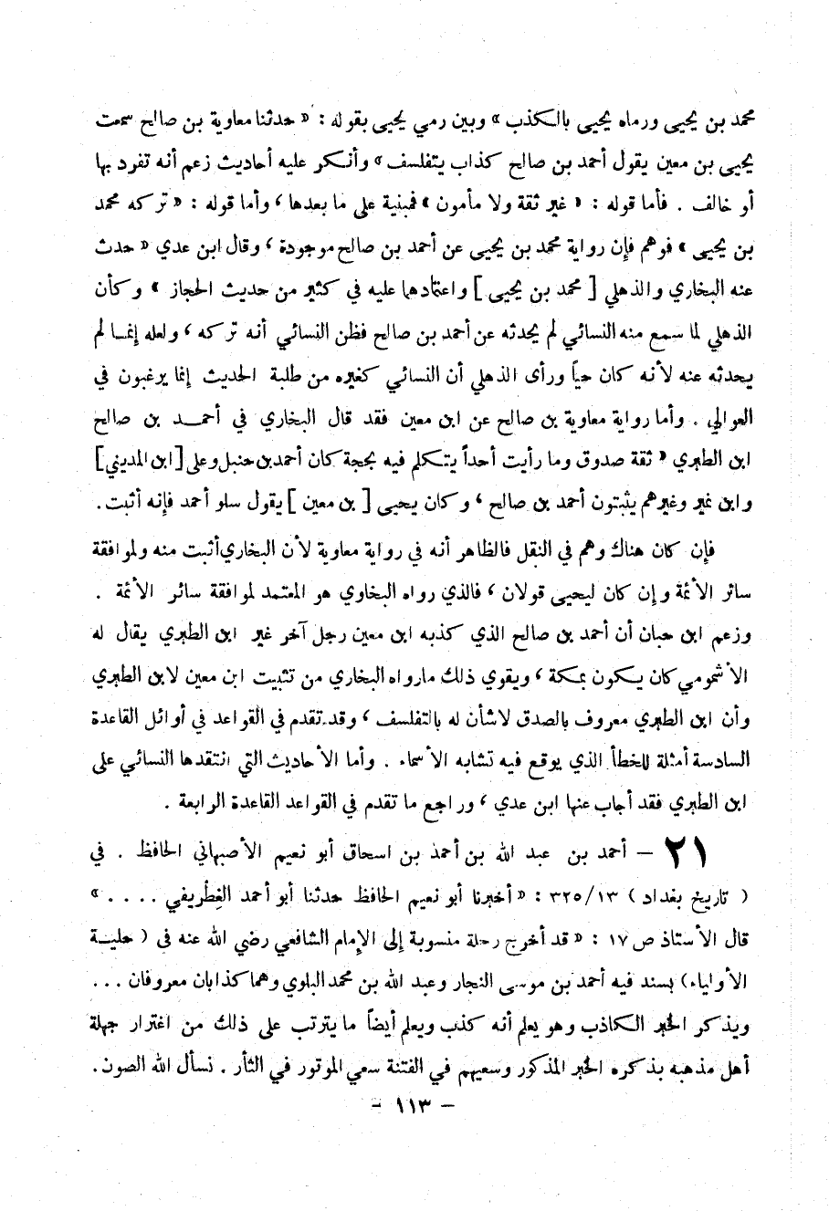 فإن كان هناك وهم في النقل فالظاهر أنه في رواية معاوية لأن البخاري أثبت منه ولموافقة سائر الأئمة وإن كان ليحيى قولان ، فالذي رواه البخاري هو المعتمد لموافقة سائر الأئمة . وزعم ابن حبان أن أحمد بن صالح الذي كذبه ابن معين رجل آخر غير ابن الطبري يقال له الأشمومي كان يكون بمكة ، ويقوي ذلك ما رواه البخاري من تثبيت ابن معين لابن الطبري وأن ابن الطبري معروف بالصدق لا شأن له بالتفلسف ، وقد تقدم في القواعد في أوائل القاعدة السادسة أمثلة للخطأ الذي يوقع فيه تشابه الأسماء . وأما الأحاديث التي انتقدها النسائي على ابن الطبري فقد أجاب عنها ابن عدي ، وراجع ما تقدم في القواعد القاعدة الرابعة .
