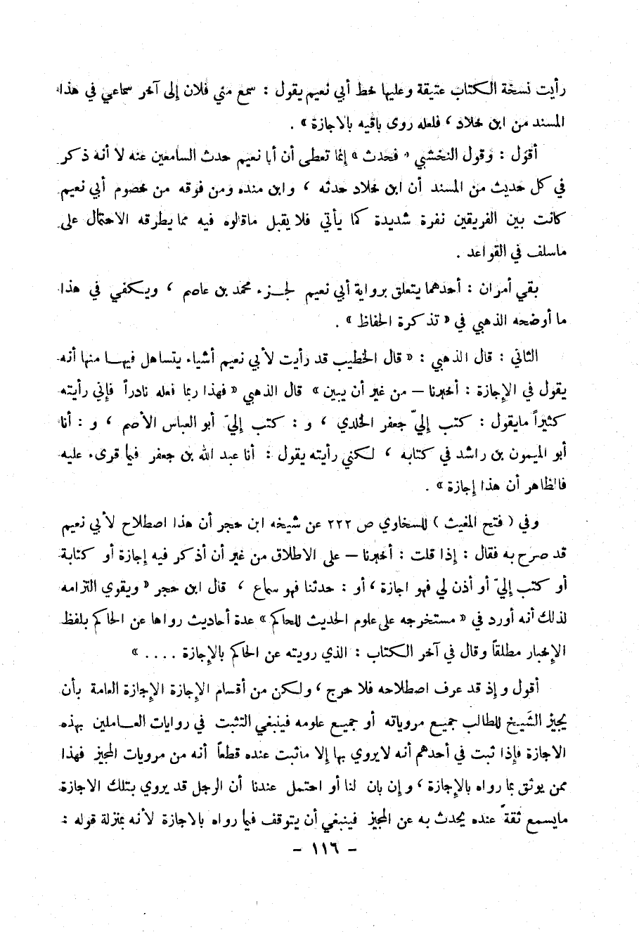 وفي ( فتح المغيث ) للسخاوي ص 222 عن شيخه ابن حجر أن هذا اصطلاح لأبي نعيم قد صرح به فقال : إذا قلت : أخبرنا - على الإطلاق من غير أذكر فيه إجازة أو كتابة أو كتب إلي أو أذن لي فهو إجازة ، أو :حدثنا فهو سماع ، قال ابن حجر (( ويقوي التزامه لذلك أنه أورد في (( مستخرجه على علوم الحديث للحاكم )) عدة أحاديث رواها عن الحاكم بلفظ الإخبار مطلقاً وقال في آخر الكتاب : الذي رويته عن الحاكم بالإجازة .... ))