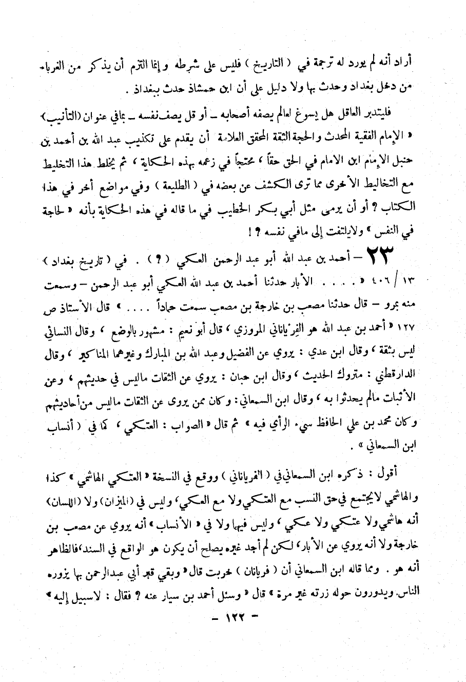23- أحمد بن عبد الله أبو عبد الرحمن العكي ( ؟ ) . في ( تاريخ بغداد ) 13/406 (( ... الأبار حدثنا أحمد بن عبد الله العكي أبو عبد الرحمن - وسمعت منه بمرو - قال حدثنا مصعب بن خارجه بن مصعب سمعت حماداً ... )) قال الأستاذ ص 127 (( أحمد ابن عبد الله هو الفرياناني المروزي ، قال أبو نعيم :مشهور بالوضع ، وقال النسائي ليس بثقة، وقال ابن عدي : يروي عن الفضيل وعبد الله بن المبارك وغيرهما المناكير ، وقال الدارقطني : متروك الحديث ، وقال ابن حبان : يروي عن الثقات ما ليس في حديثهم ، وعن الأثبات ما لم يحدثوا به ، وقال ابن السمعاني : وكان ممن يروي عن الثقات ما ليس من أحاديثهم وكان محمد بن علي الحافظ سيئ الرأي فيه )) ثم قال (( الصواب : العتكي، كما في ( أنساب ابن السمعاني ) )) .