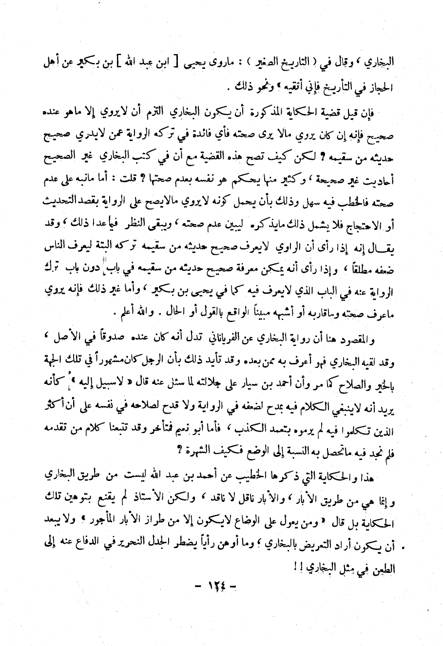 فإن قيل قضية الحكاية المذكورة أن يكون البخاري التزم أن لا يروي إلا ما هو عنده صحيح فأنه إن كان يروي مالا يرى صحته فأي فائدة في تركه الرواية عمن لا يدري صحيح حديثه من سقيمه؟ لكن كيف تصح هذه القضية مع أن كتب البخاري غير الصحيح أحاديث غير صحيحة، وكثير منها يحكم هو نفسه بعدم صحتها؟ قلت: أما ما نبه على عدم صحته فالخطب فيه سهل وذلك بأن يحمل كونه لا يروي ما لا يصح على الرواية بقصد التحديث أو الاحتجاج فلا يشمل ذلك ما يذكره ليبين عدم صحته، ويبقى النظر فيما عدا ذلك، وقد يقال أنه إذا رأى أن الراوي لا يعرف صحيح حديثه من سقيمه تركه البتة ليعرف الناس ضعفه مطلقاً، وإذ رأى أنه يمكن معرفة صحيح حديثه من سقيمه في باب دون باب ترك الرواية عنه في الباب الذي لا يعرف فيه كما في يحيى بن بكير، وأما غير ذلك فأنه يروي ما عرف صحته وما قاربه أو أشبهه مبيناً الواقع بالقول أو الحال. والله أعلم.