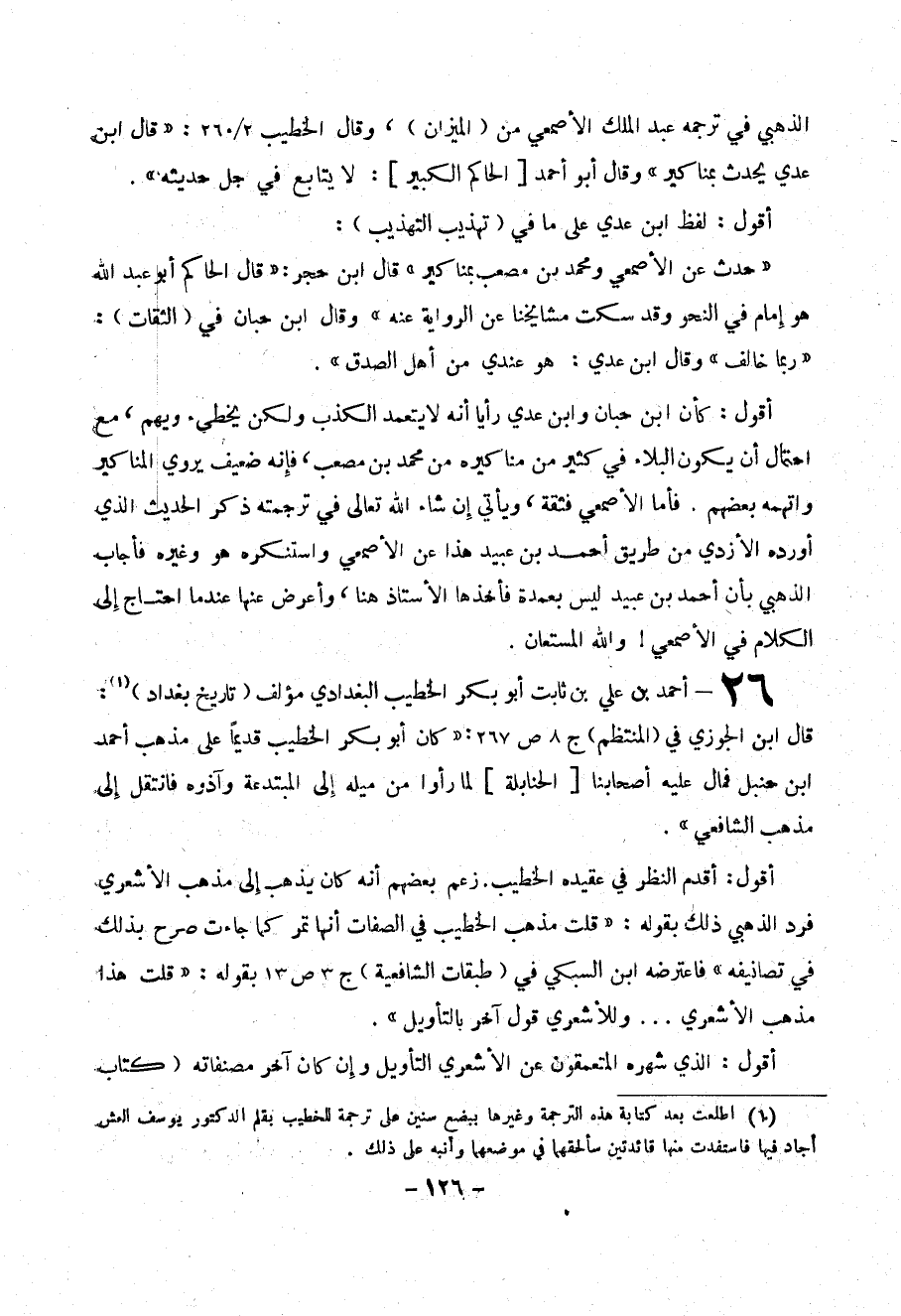 الذهبي في ترجمة عبد الملك الأصمعي من (الميزان)، وقال الخطيب 2/ 260: ((قال ابن عدي يحدث بمناكير)) وقال أبو أحمد [الحاكم الكبير]: لا يتابع في جل حديثه)).