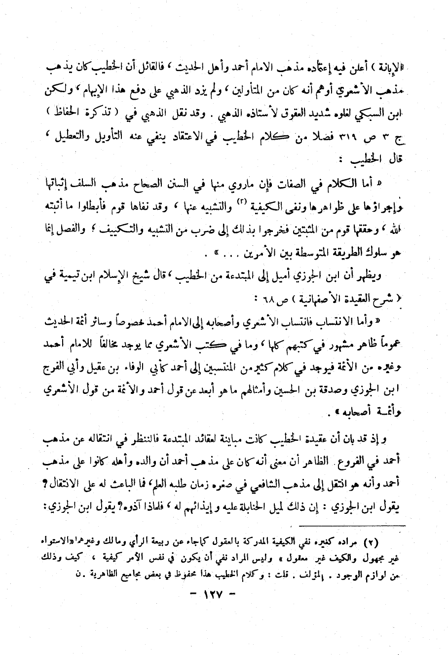 الإبانة) أعلن فيه اعتماده مذهب الإمام أحمد وأهل الحديث، فالقائل أن الخطيب كان يذهب مذهب الأشعري أوهم أنه كان من المتأولين، ولم يزد الذهبي على دفع هذا الإيهام، ولكن ابن السبكي لغلوه شديد العقوق لأستاذه الذهبي. وقد نقل الذهبي في (تذكرة الحفاظ) ج 3 ص 319 فصلاً من كلام الخطيب في الاعتقاد ينفي عنه التأويل والتعطيل، قال الخطيب: