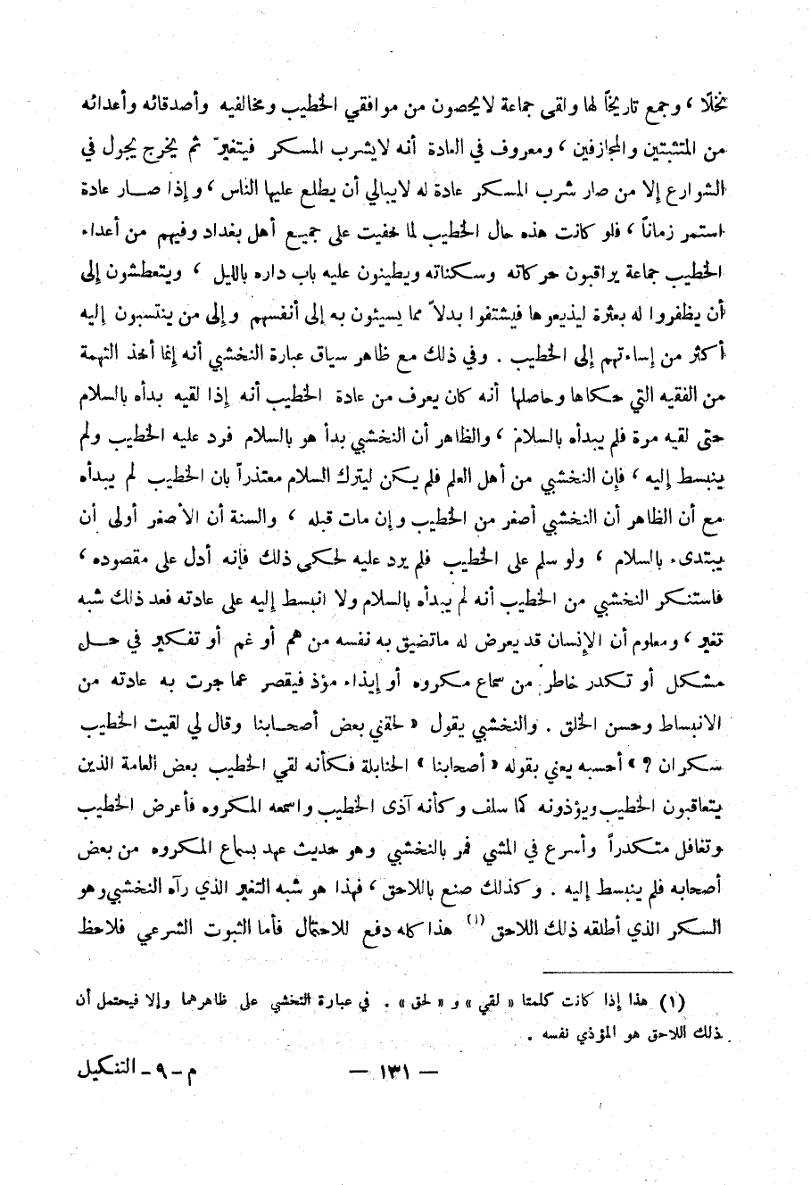 نخلاً، وجمع تاريخاً لها ولقي جماعة لا يحصون من موافقي الخطيب ومخالفيه وأصدقائه وأعدائه من المتثبتين والمجازفين، ومعروف في البادة أنه لا يشرب المسكر فيتغير ثم يخرج يجول في الشوارع إلا من صار شرب المسكر عادة له لا يبالي أن يطلع عليها الناس، وإذا صار عادة استمر زماناً، فلو كانت هذه حال الخطيب لما خفيت على جميع أهل بغداد وفيهم من أعداء الخطيب جماعة يراقبون حركاته وسكناته ويطينون عليه باب داره بالليل، ويتعطشون إلى أن يظفروا له بعثرة ليذيعوها فيشتفوا بدلاً مما يسيئون به إلى أنفسهم وإلى من ينتسبون إليه أكثر من إساءتهم إلى الخطيب. وفي ذلك مع ظاهر سياق عبارة النخشعي أنه إنما أخذ التهمة من الفقيه التي حكاها وحاصلها أنه كان يعرف من عادة الخطيب أنه إذا لقيه بدأه بالسلام حتى لقيه مرة فلم يبدأه بالسلام، والظاهر أن النخشبي بدأ هو بالسلام فرد عليه الخطيب ولم ينبسط إليه، فإن النخشبي من أهل العلم فلم يكن ليترك السلام معتذراً أن الخطيب لم يبدأه مع أن الظاهر أن النخشبي أصغر من الخطيب وإن مات قبله، والسنة أن الأصغر أولى أن يبتدئ بالسلام ولو سلم الخطيب فلم يرد عليه لحكى ذلك فأنه أدل على مقصوده، فاستنكر النخشبي من الخطيب أنه لم يبدأه بالسلام ولا أنبسط إليه على أعادته فعد ذلك الشبه تغير، ومعلوم أن الإنسان قد يعرض له ما تضيق به نفسه من هم أو غم أو تفكير في حل مشكل أو تكدر خاطر من سماع مكروه أو إيذاء مؤذ فيقصر عما جرت به عادته من الانبساط وحسن الخلق. والنخشبي يقول ((لحقني بعض أصحابنا وقال لي لقيت الخطيب سكران؟)) أحسبه يعني بقوله (أصحابنا) الحنابلة فكأنه لقي الخطيب بعض العامة الذين يتعاقبون الخطيب ويأذونه كما سلف وكأنه آذى الخطيب واسمعه المكروه فأعرض الخطيب وتغافل متكدراً وأسرع في المشي فمر بالنخشبي وهو حديث عهد بسماع المكروه من بعض أصحابه فلم ينبسط إليه، وكذلك صنع باللاحق فهذا هو شبه التغيير الذي أراه النخشبي وهو السكر الذي أطلقه ذلك اللاحق (1) هذا كله دفع للاحتمال فأما الثبوت الشرعي فلاحظ