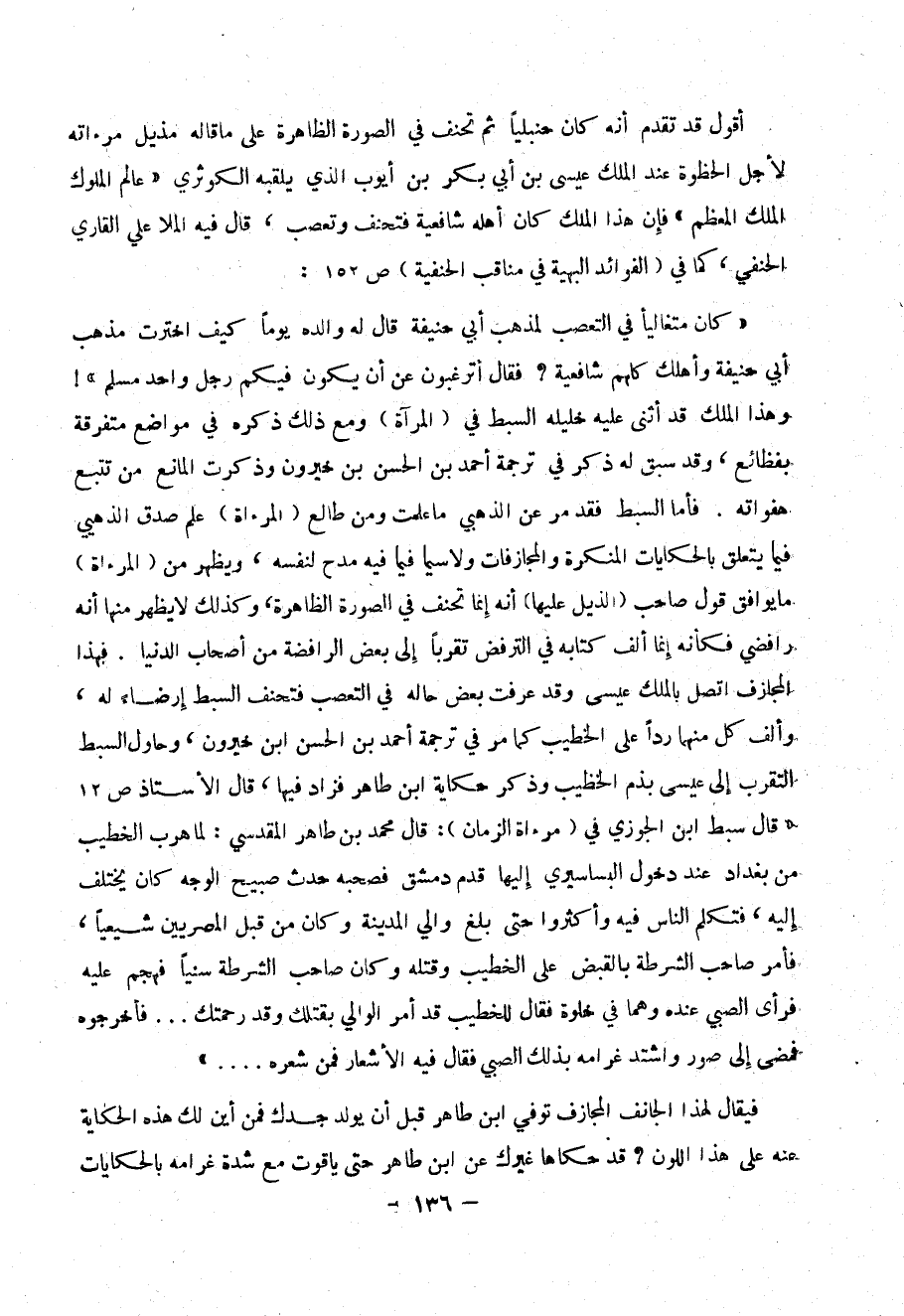 ((كان متغالياً في التعصب لمذهب أبي حنيفة قال له والده يوماً كيف اخترت مذهب أبي حنيفة وأهلك كلهم شافعية؟ فقال أترغبون عن أن يكون فيكم رجل واحد مسلم))! وهذا الملك قد أثنى عليه خليله السبط في (المرآة) ومع ذلك ذكره في مواضع متفرقة بفظائع، وقد سبق له ذكر في ترجمة أحمد بن الحسن بن خيرون وذكرت المانع من تتبع هفواته. فأما السبط فقد مر عن الذهبي ما علمت ومن طالع (المرءاة) علم صدق الذهبي فيما يتعلق بالحكايات المنكرة والمجازفات ولا سيما فيما فيه مدح لنفسه، ويظهر من (المرءاة) ما يرافق قول صاحب (الذيل عليها) أنه إنما تحنف في الصورة الظاهرة، وكذلك لا يظهر منها أنه رافضي فكأنه إنما ألف كتابه في الترفض تقرباً إلى بعض الرافضة من أصحاب الدنيا. فهذا المجازف اتصل بالملك عيسى وقد عرفت بعض حاله في التعصب فتحنف السبط إرضاء له، وألف كل منهما رداً على الخطيب كما مر في ترجمة أحمد بن الحسن ابن خيرون، وحاول السبط التقرب إلى عيسى بذم الخطيب وذكر حكاية ابن طاهر فزاد فيها، قال الأستاذ ص12 ((قال سبط ابن الجوزي في (مرءاة الزمان): قال محمد بن طاهر المقدسي: لما هرب الخطيب من بغداد عند دخول البساسيري إليها قدم دمشق فصحبه حدث صبيح الوجه كان يختلف إليه، فتكلم الناس فيه وأكثروا حتى بلغ والي المدينة وكان من قبل المصريين شيعياً، فأمر صاحب الشرطة بالقبض على الخطيب وقتله وكان صاحب الشرطة سئياً فهجم عليه فرأى الصبي عنده وهما في خلوة فقال للخطيب قد أمر الوالي بقتلك وقد رحمتك ... فأخرجوه فمضى إلى صور واشتد غرامه بذلك الصبي فقال فيه الشعار فمن شعره .... )).