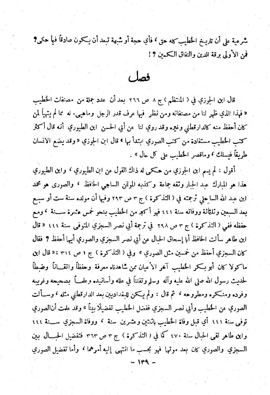 أقول: لم يسم ابن الجوزي من حكى له ذاك القول عن ابن الطيوري، وابن الطيوري هذا هو المبارك عبد الجبار وثقه جماعة وكذبه المؤتمن الساجي الحافظ، والصوري هو محمد بن عبد الله الساحلي ترجمته في (التذاكرة) ج 3 ص 293 وفيها أن مولده سنة ست أو سبع بعد السبعين وثلاثمائة ووفاته سنة 441 فهو أكبر من الخطيب بنحو خمس عشرة سنة، ومع حفظه ففي (التذكرة) ج3 ص 298 في ترجمة أبي نصر السجزي المتوفى سنة 444 ((قال ابن طاهر سألت الحافظ أبا إسحاق الحبال عن أبي نصر السجزي والصوري أيهما أحفظ؟ فقال كان السجزي أحفظ من خمسين مثل الصوري)) وفي (التذكرة) ج 1 ص 314: ((قال ابن ماكولا كان أبو بكر الخطيب آخر الأعيان ممن شاهدناه معرفة وحفظاً واتقاناً وضبطاً لحديث رسول الله صلى الله عليه وآله وسلم وتفنناً في علله وأسانيده وعلماً بصحيحه وغريبه وفرده ومنكره ومطروحه، ثم قال: ولَم يكن للبغداديين بعد الدارقطني مثله، وسألت الصوري عن الخطيب وأبي نصر السجزي ففضل الخطيب تفضيلاً بيناً)) وقد علمت أن الصوري توفي سنة 441 أي قبل وفاة الخطيب باثنتين وعشرين سنة، ووفاة السجزي سنة 444 وابن طاهر لقي الحبال سنة 470 كما في (التذكرة) ج 3 ص 363 فتفضيل الحبال بين السجزي والصوري كان بعد موتهما فهو بحسب ما انتهى إليه أمرهما، وأما تفضيل الصوري