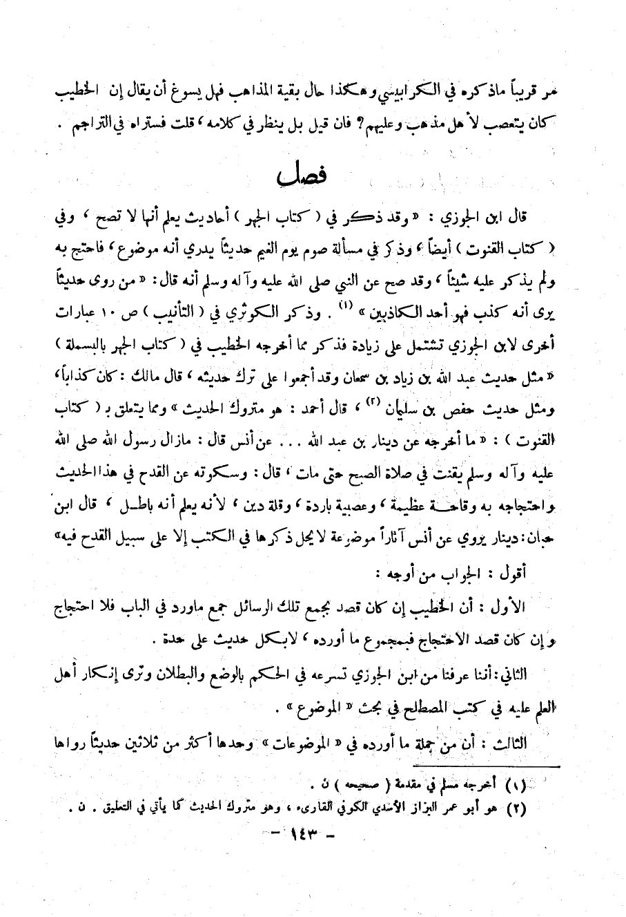 (كتاب القنوت) أيضاً، وذكر مسألة صوم في يوم الغيم حديثاً يدري أنه موضوع، فاحتج به ولم يذكر عليه شيئاً، وقد صح عن النبي صلى الله عليه وآله وسلم أنه قال: ((من روى حديثاً يرى أنه كذب فهو أحد الكاذبين)) (1). وذكر الوثري في (التأنيب) ص10 عبارات أخرى لابن الجوزي تشتمل على زيادة فذكر مما أخرجه الخطيب في
