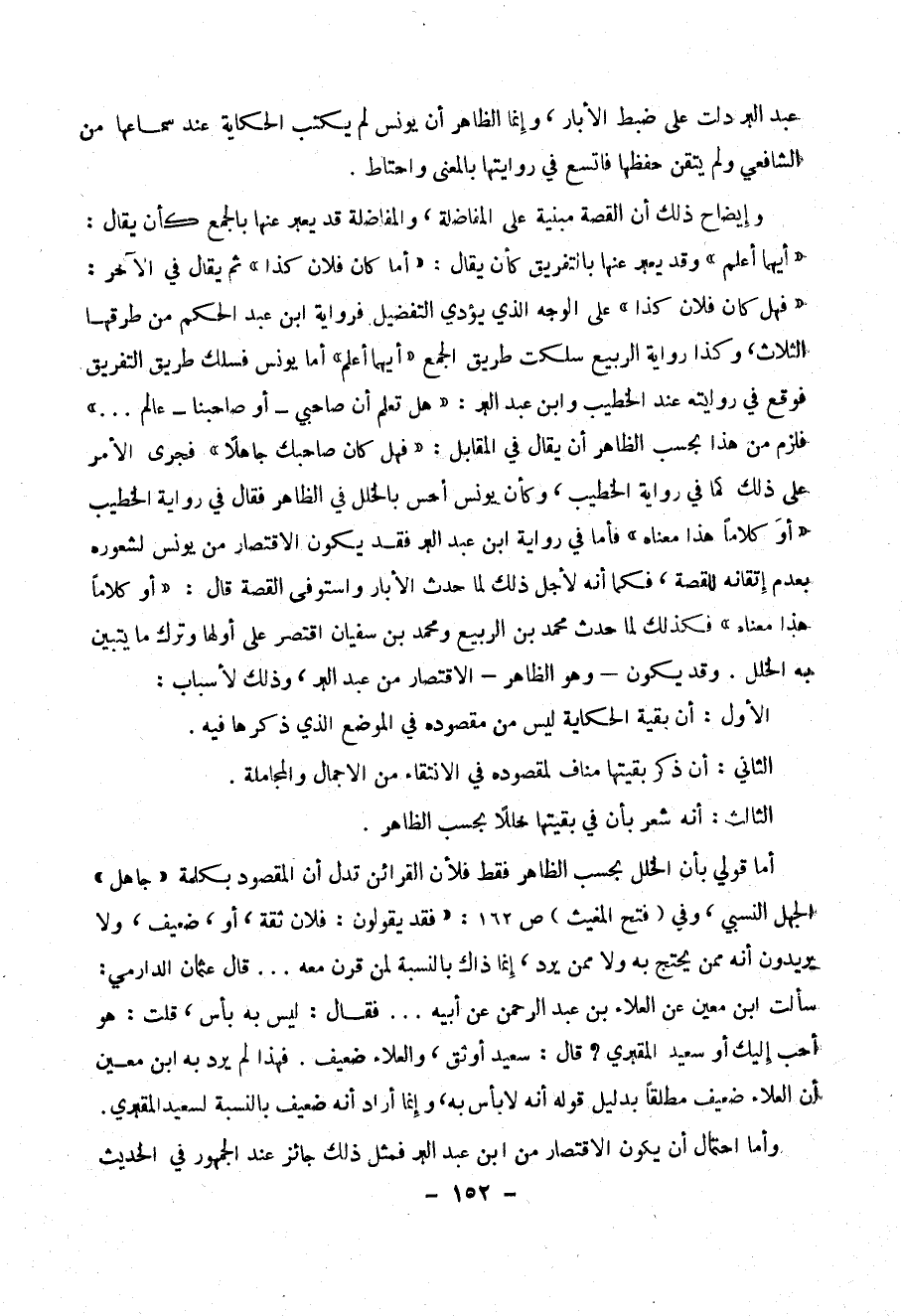 وإيضاح ذلك أن القصة مبنية على المفاضلة، والمفاضلة قد يعبر عنها بالجمع كأن يقال: ((أيهما أعلم)) وقد يعبر عنها بالتفريق كأن يقال: ((وأما كان فلان كذا)) ثم يقال في الآخر: ((فهل كان فلان كذا)) على الوجه الذي يؤدي التفضيل فرواية ابن عبد الحكم من طرقها الثلاث، وكذا رواية الربيع سلكت طريق الجمع ((أيهما أعلم)) أما يونس فسلك طريق التفريق فوقع في روايته عند الخطيب وابن عبد البر: ((هل تعلم أن صاحبي - أو صاحبنا - عالم ... )) فلزم من هذا بحسب الظاهر أن يقال في المقابل: ((فهل كان صاحبك جاهلاً)) فجرى الأمر على ذلك كما في رواية الخطيب، وكأن يونس أحس بالخلل في الظاهر فقال في رواية الخطيب ((أو كلاماً هذا معناه)) فأما في رواية ابن عبد البر فقد يكون الاقتصار من يونس لشعوره بعدم إتقانه للقصة، فكما أنه لأجل ذلك لما حدث الأبار واستوفى القصة، فكما أنه لأجل ذلك لما حدث الأبار واستوفى القصة قال: ((أو كلاماً هذا معناه)) فكذلك لما حدث الأبار واستوفى القصة قال: ((أو كلاماً هذا معناه)) فكذلك لما حدث محمد بن الربيع ومحمد بن سفيان اقتصر على أولها وترك ما يتبين به الخلل. وقد يكون - وهو الظاهر - الاقتصار من عبد البر، وذلك لأسباب: