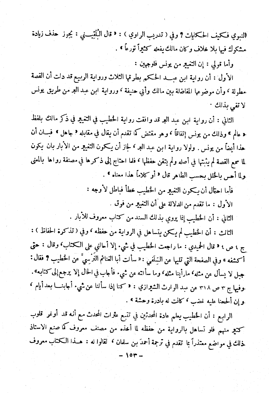 الثاني أن رواية ابن عبد البر قد وافقت رواية الخطيب في التغيير في ذكر مالك بلفظ ((عالم)) وذلك من يونس اتفاقاً، وهو مقتض كما تقدم أن يقال في مقابله ((جاهل)) فبان أن هذا أيضاً من يونس. ولولا رواية ابن عبد البر، لجاز أن يكون التغيير من الأبار بأن يكون لما سمع القصة لم يثبتها في أصله ولم يتقن حفظها، فلما احتاج إلى ذكرها في مصنفة رواها بالمعنى ولما أحس بالخلل بحسب الظاهر قال ((أو كلاماً هذا معناه)).