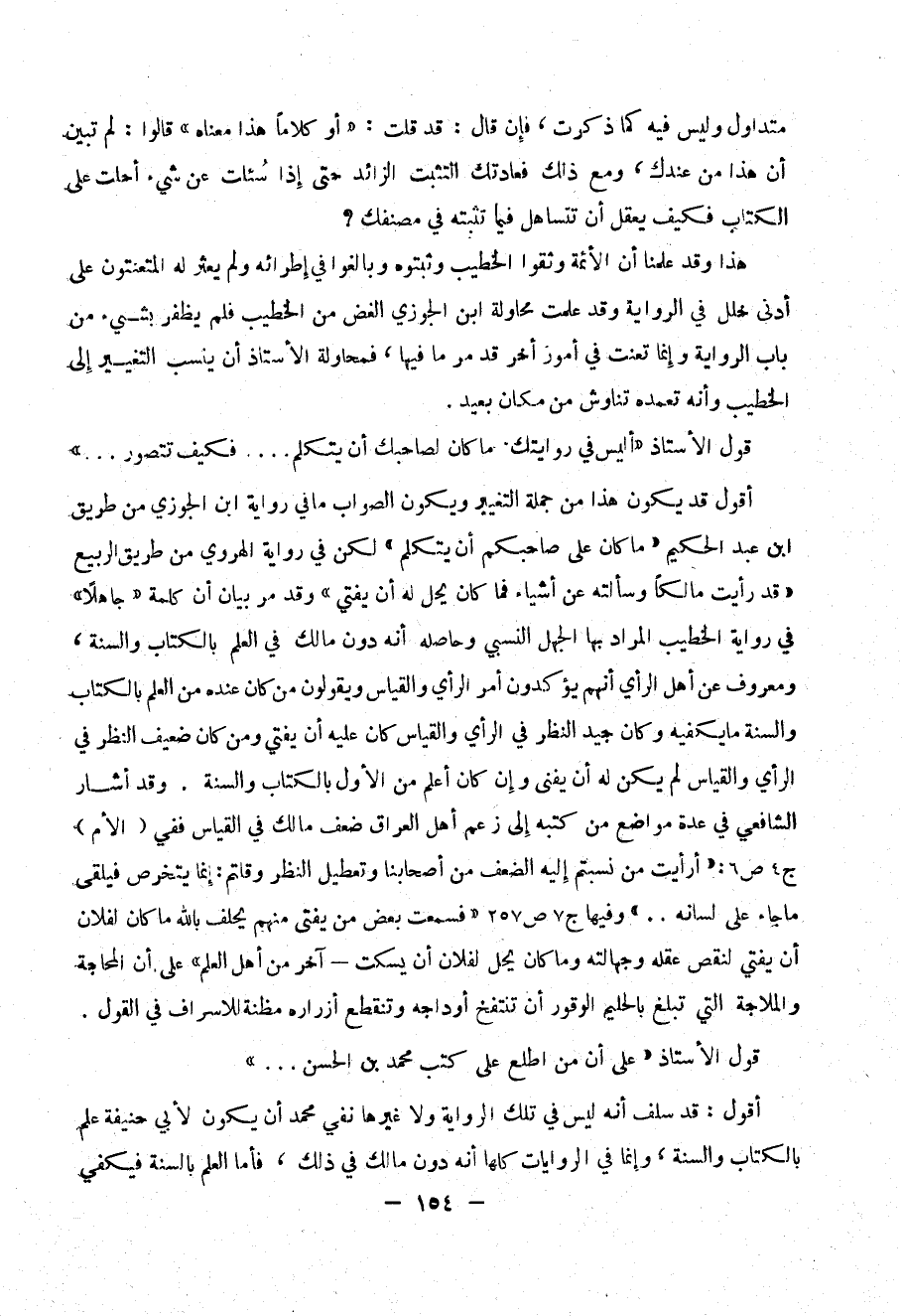 أقول: قد سلف أنه ليس في تلك الرواية ولا غيرها نفي محمد أن يكون لأبي حنيفة علم بالكتاب والسنة، وإنما في الروايات كلها أنه دون مالك في ذلك، فأما العلم بالسنة فيكفي