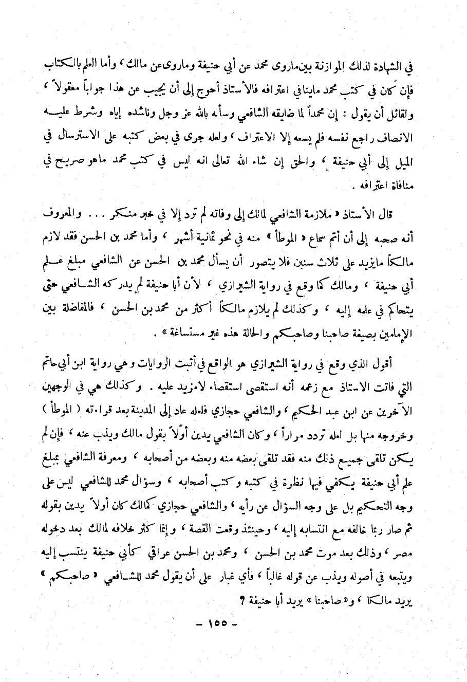 أقول الذي وقع في رواية الشيرازي هو الواقع في أثبت الروايات وهي رواية ابن أبي حاتم التي فاتت الأستاذ م زعمه أنه استقصى استقاء لا مزيد عليه. وكذلك هي في الوجهين الآخرين عن ابن عبد الحكيم، والشافعي حجازي فلعله عاد إلى المدينة بعد قراءته (الموطأ) وخروجه منها بل لعله تردد مراراً، وكان الشافعي، وكان الشافعي يدين أوّلاً بقول مالك ويذب عنه، فإن لم يكن تلقى جميع ذلك منه فقد تلقى بعضه منه وبعضه من أصحابه، ومعرفة الشافعي بمبلغ علم أبي حنيفة يكفي فيه نظرة في كتبه وكتب أصحابه، وسؤال محمد للشافعي ليس على وجه التحكيم بل على وجه السؤال عن رأيه، والشافعي حجازي كمالك كان أولاً يدين بقوله ثم صار ربما خالفه مع انتسابه إليه، وحينئذ وقعت القصة، وإنما أكثر خلافه لمالك بعد دخوله مصر، وذلك بعد موت محمد ابن الحسن، ومحمد بن الحسن عراقي كأبي حنيفة ينتسب إليه ويتبعه في أصوله ويذب عن قوله غالباً، فأي غبار على أن يقول محمد للشافعي ((صاحبكم)) يريد مالكاً و((صاحبنا)) يريد أبا حنيفة؟