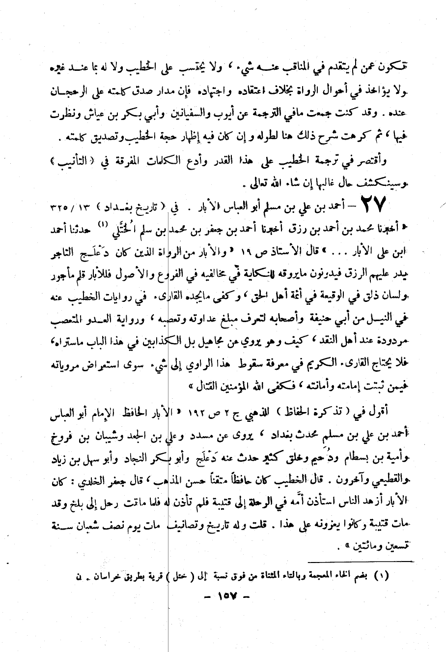 27 - أحمد بن علي بن مسلم أبو العباس الأبار. في (تاريخ بغداد) 13/ 325 ((أخبرنا محمد بن أحمد بن رزق أخبرنا أحمد بن جعفر بن محمد بن سلم الخُتَّلي حدثنا أحمد ابن على الأبار ... )) قال الأستاذ ص19 ((والأبار من الرواة الذين كان دعلج التاجر يدر عليهم الرزق فيدونون ما يروقه للنكاية في مخالفيه في الفروع والأصول فللأبار قلم مأجور ولسان ذلق في الوقيعة في أئمة أهل الحق، وكفى ما يجده القارئ في روايات الخطيب عنه في النيل من أبي حنيفة وأصحابه لتعرف مبلغ عدواته وتعصبه، ورواية العدو المتعصب مردودة عند أهل النقد، كيف وهو يروي عن مجاهيل بل الكذابين في هذا الباب ما ستراه، فلا يحتاج القارئ الكريم في معرفة سقوط هذا الراوي إلى شيء سوى استعراض مروياته فيمن ثبتت إمامته وأمانته، فكفى الله المؤمنين القتال)).