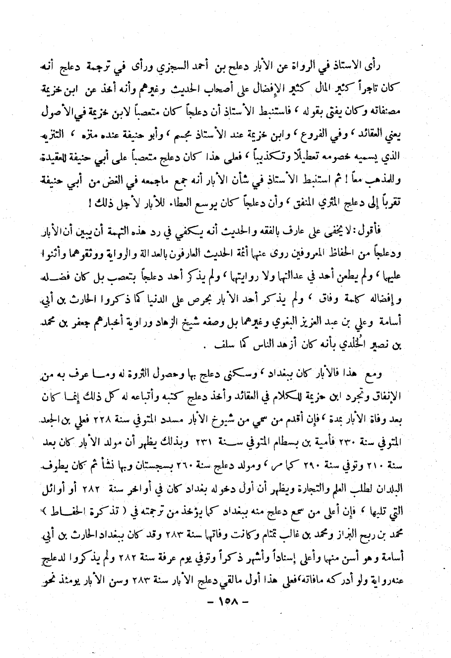 رأى الأستاذ في الرواة عن الأبار دعلج بن أحمد السجزي ورأى في ترجمة دعلج أنه كان تاجراً كثير المال كثير الأفضال على أصحاب الحديث وغيرهم وأنه أخذ عن ابن خزيمة مصنفاته وكان يفتي بقوله، فاستبط الأستاذ أن دعلجاً كان متعصباً لابن خزيمة في الأصول يعني العقائد، وفي الفروع، وابن خزيمة عند الأستاذ مجسم، وأبو حنيفة عنده منزه، والتنزيه الذي يسميه خصومه تعطيلاً وتكذيباً، فعلى هذا كان دعلج متعصباً عند أبي حنيفة للعقيدة وللمذهب معاً! ثم استنبط الأستاذ في شأن الأبار أنه جمع ما جمعه في الغض من أبي حنيفة تقرباً إلى دعلج المثري المنفق، وأن دعلجاً كان يوسع العطاء للأبار لأجل ذلك!