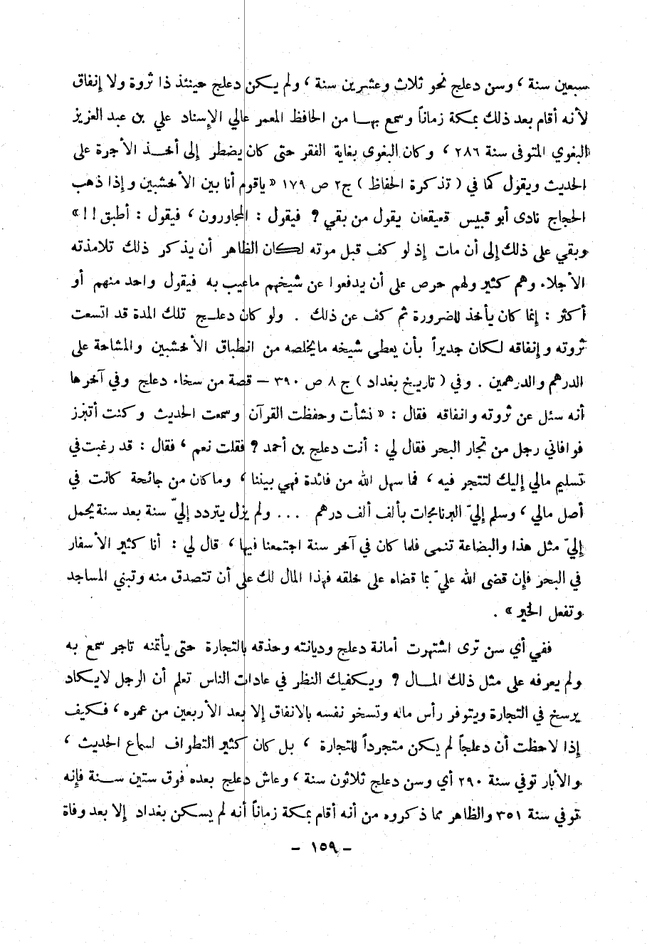 سبعين سنة، وسن دعلج نحو ثلاث وعشرين سنة، ولم يكن دعلج حينئذ ذا ثروة ولا إنفاق لأنه أقام بعد ذلك بمكة زمناً وسمع بها من الحافظ المعمر عالي الإسناد على بن عبد العزيز البغوي المتوفى سنة 286، وكان البغوي بغاية الفقر حتى كان يضطر إلى أخذ الأجرة على الحديث ويقول كما في (تذكرة الحفاظ) ج2 ص179 ((يا قوم أنا بين الأخشبين وإذا ذهب الحجاج نادى أبو قبيس قعيقعان يقول من بقي؟ فيقول: المجاورون، فيقول: أطبق!!)) وبقي من ذلك إلى أن مات إذ لو كف قبل موته لكان الظاهر أن يذكر ذلك تلامذته الأجلاء وهم كثير ولهم حرص على أن يدفعوا عن شيخهم ما عيب به فيقول واحد منهم أو