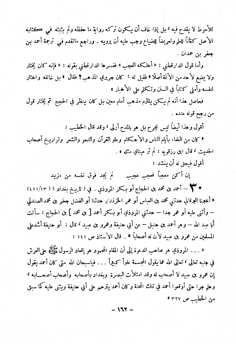 30 - أحمد بن محمد بن الحجاج أبو بكر المروذي. وفي (تاريخ بغداد) (13/ 411) ((أخبرنا البرقاني حدثني محمد بن العباس أبو عمر الخزندار حدثنا أبو الفضل جعفر ابن محمد الصندلي - وأثنى عليه أبو عمر - حدثني المروذي أبو بكر أحمد [بن محمد] بن الحجاج: سألت أبا عبد الله - وهو أحمد بن حنبل - عن أبي حنيفة وعمرو بن عبيد، قال: أبو حنيفة أشد على المسلمين من عمرو بن عبيد لأن له أصحاباً)). قال الأستاذ ص141: (( ... المروذي هو صاحب الدعوة إلى أن المقام المحمود هو إقعاد الرسول - صلى الله عليه وسلم - على العرش في جنبه تعالى، تعالى الله عما يقول المجسمة علواً كبيراً .. فيا سبحان الله متى كان أحمد يقول إن عمرو بن عبيد لا أصحاب له وقد امتلأت البصرة وبغداد بأصحابه وأصحاب أصحابه، وهلم جرا حتى أوقعوا أحمد في تلك المحنة وكان أحمد يترحم على أبي حنيفة ويثني عليه كما سبق من الخطيب ص 327)).