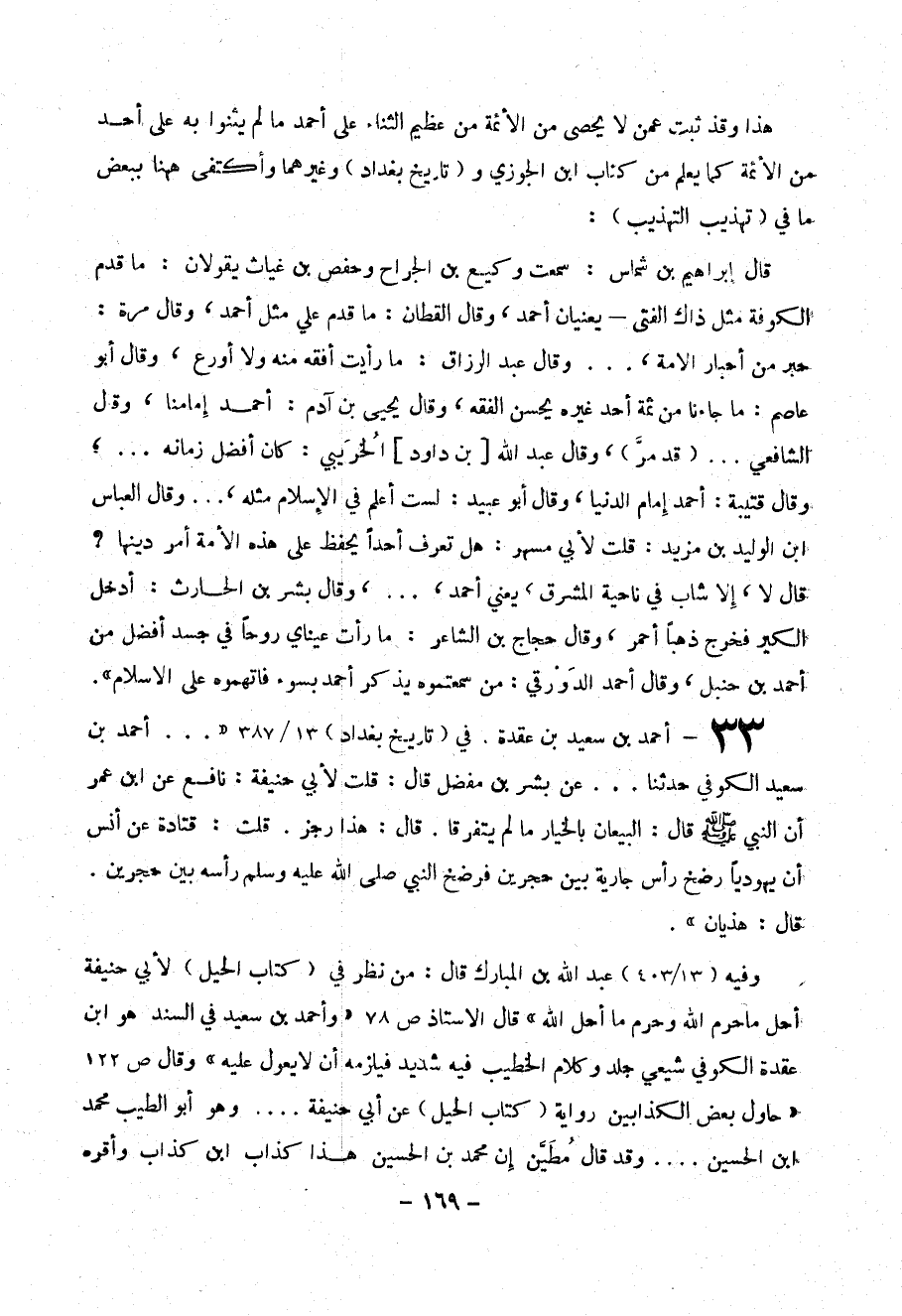 33 - أحمد بن سعيد بن عقدة. في (تاريخ بغداد) 13/ 387 (( ... أحمد بن سعيد الكوفي حدثنا ... عن بشر بن مفضل قال: قلت: لأبي حنيفة: نافع عن ابن عمر أن النبي - صلى الله عليه وسلم - قال: البيعان بالخيار ما لم يتفرقا. قال: هذا رجز. قلت: قتادة عن أنس